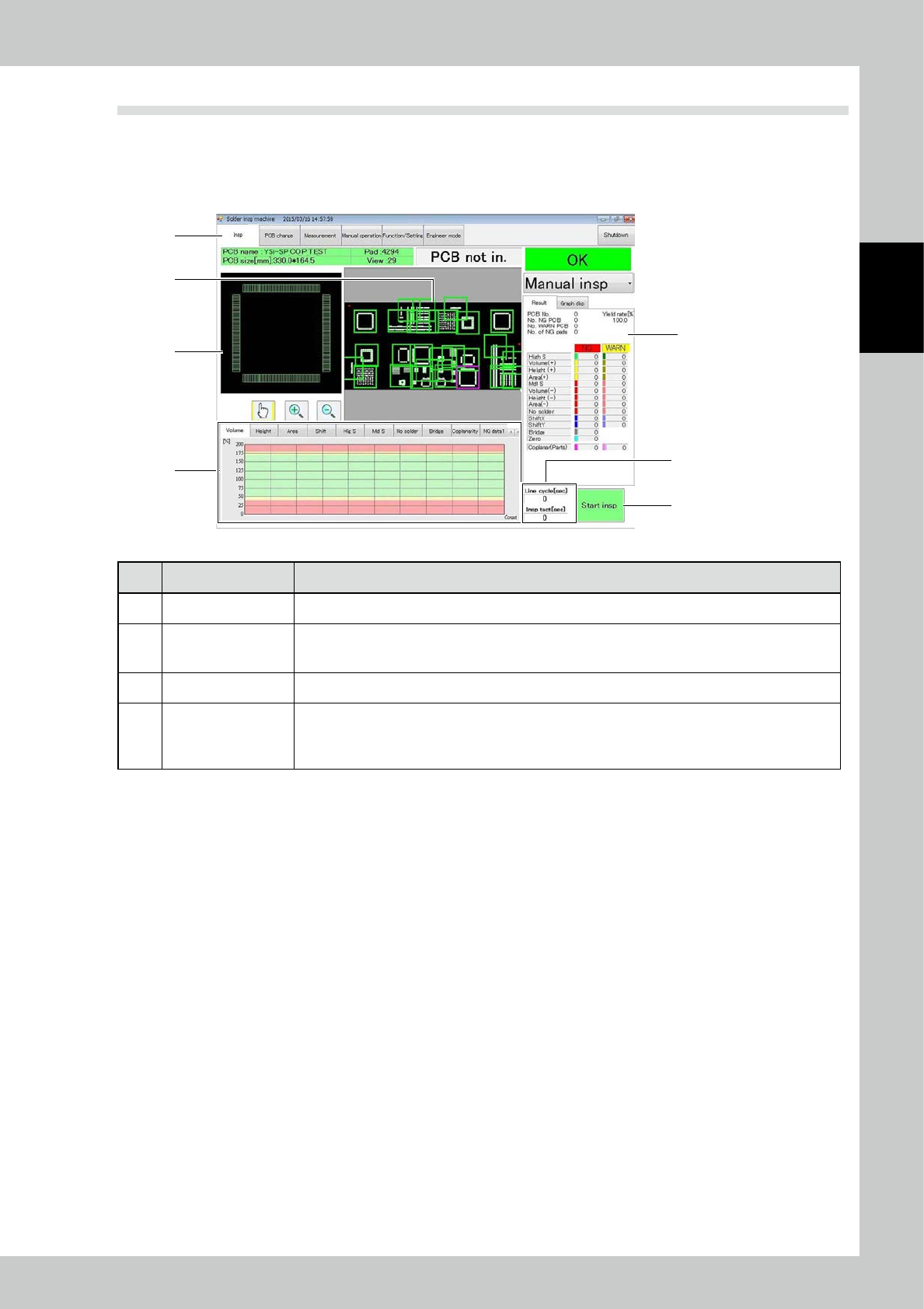 Insp Check the image of the PCB being inspected and inspection results. "3.2 Inspection"