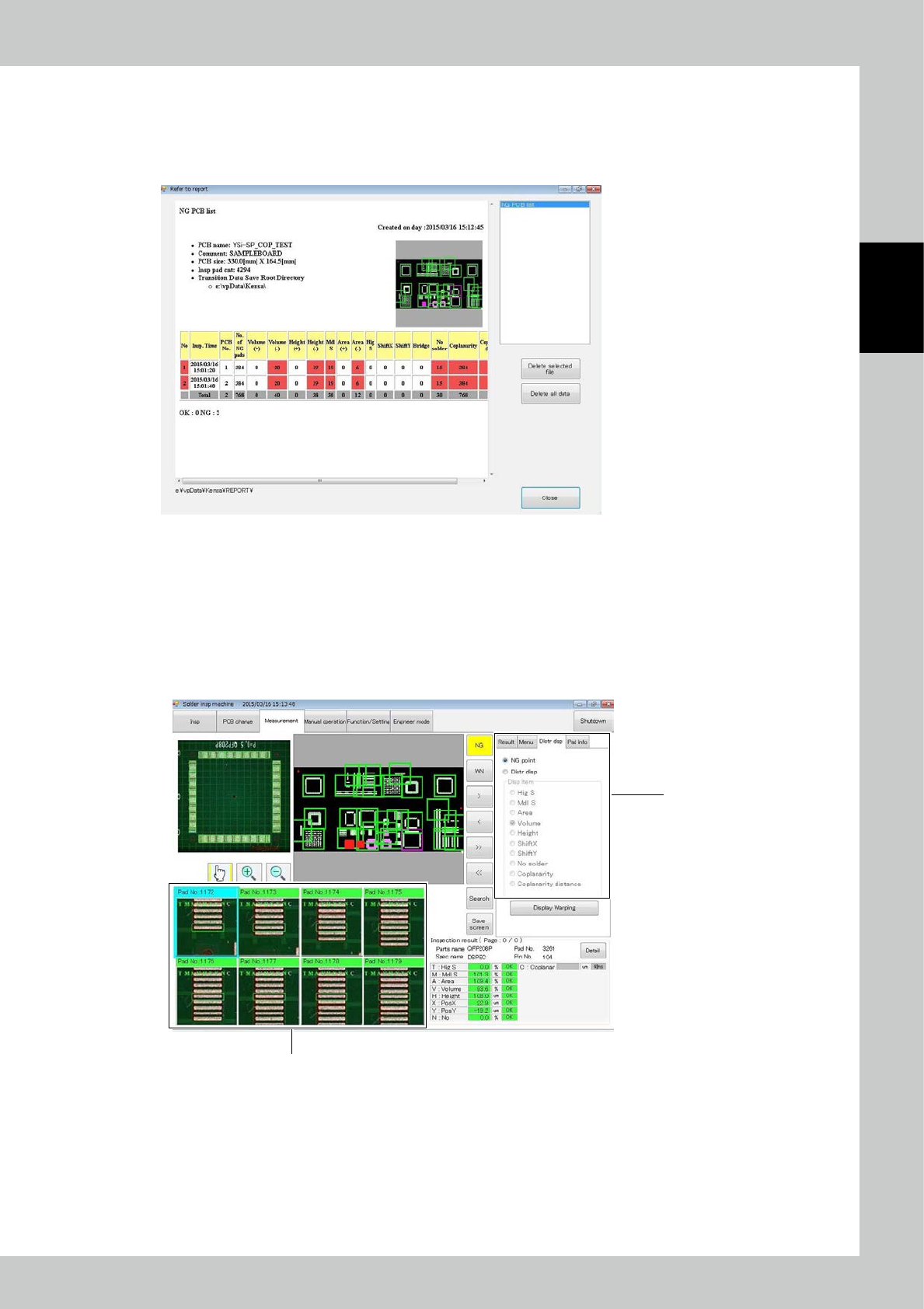 2-29 2 Operation 3.4.3 NG PCB list T he contents to be chec ked are only the PCB number of the faulty PCB and fault frequency of each inspection item. Details can be chec ked with the software at the data station. 24230-…