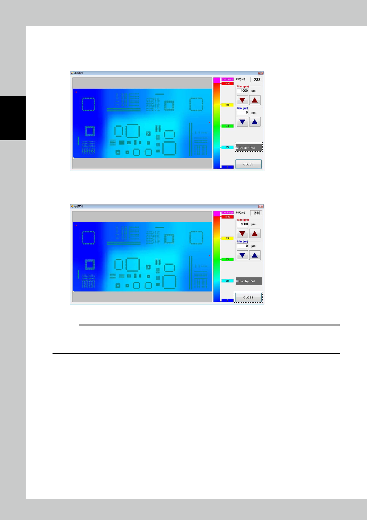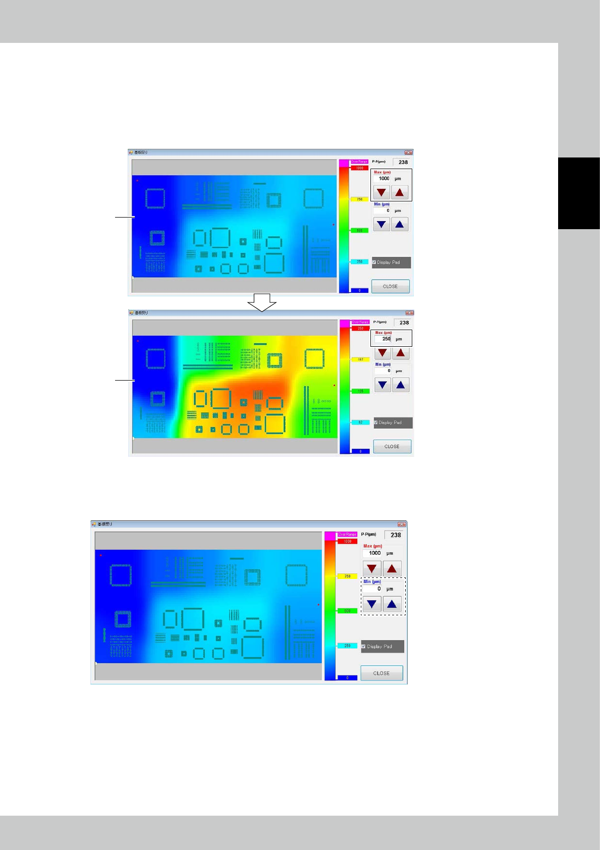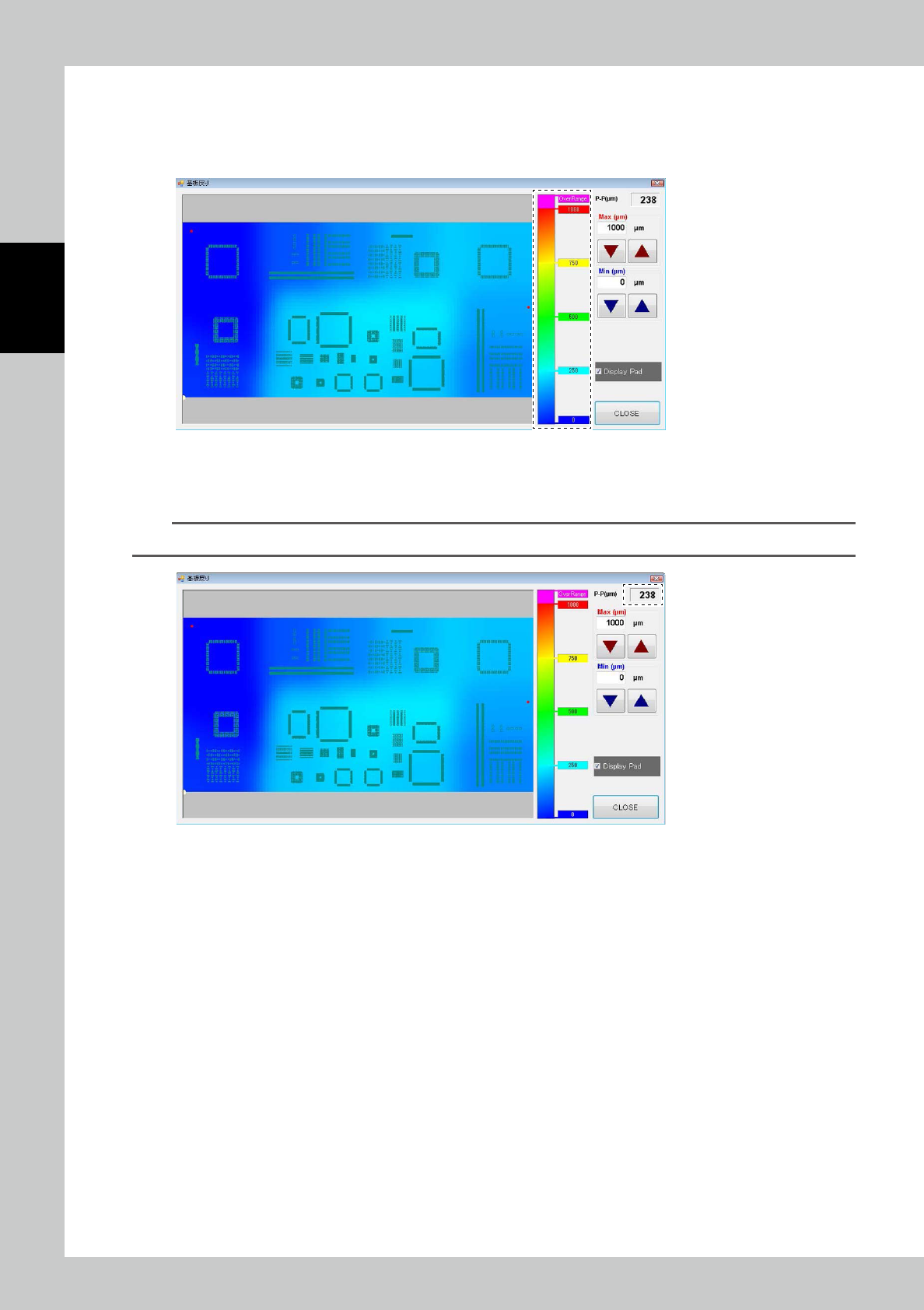 2-33 2 Operation 7. Changing max value of displaying function 1. It set max v alue of PCB warping range of displa ying. It is possible to show up the grade of w arping distribution by adjusting this value. Initial v alue…