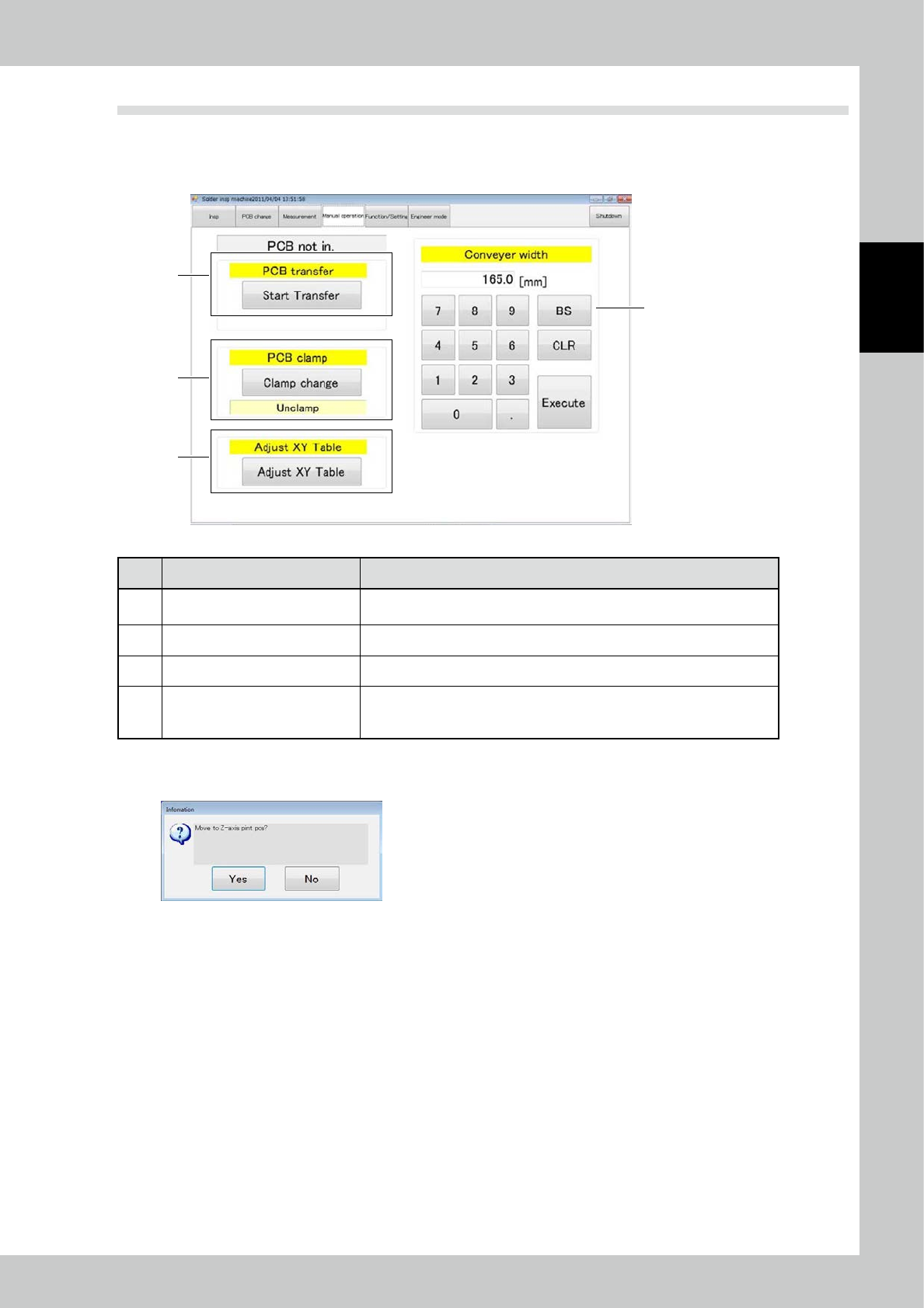 2-35 2 Operation 3.5 Manual Operation Items displa yed on the manual operation screen and functions are described. On the manual operation screen, you can manually tr ansfer the PCB or switch the PCB clamp. T ouch the [X…