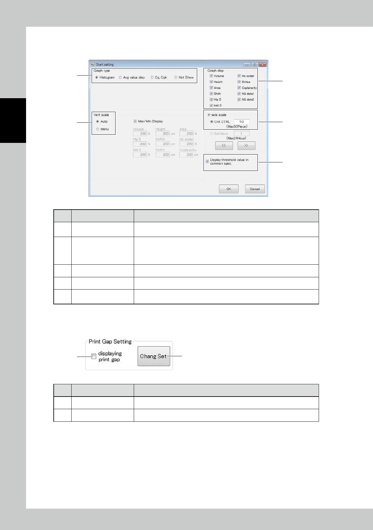 2-44 2 Operation 3.6.5 Char t Setting Enter graph settings displa yed on the inspection tab. 1 3 4 5 2 24255-KMN-00 No Name Description of displayed item and functions 1 Graph type The graph type to be displayed can be s…