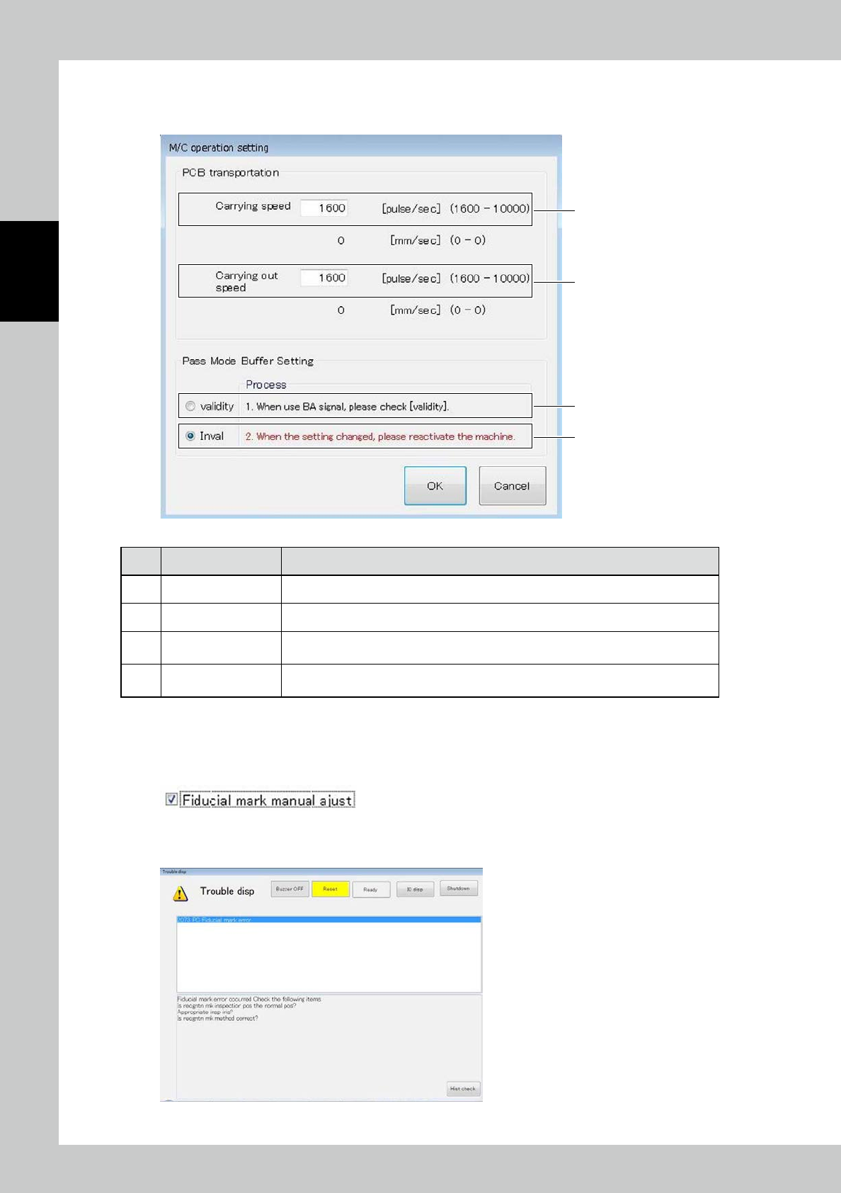 2-46 2 Operation 3.6.7 M/C operation setting T he PCB transportation speed can be changed. 1 2 3 4 24259-KMN-00 No Name Description of displayed item and functions 1 Carrying speed Enter the conveyor speed for carrying t…