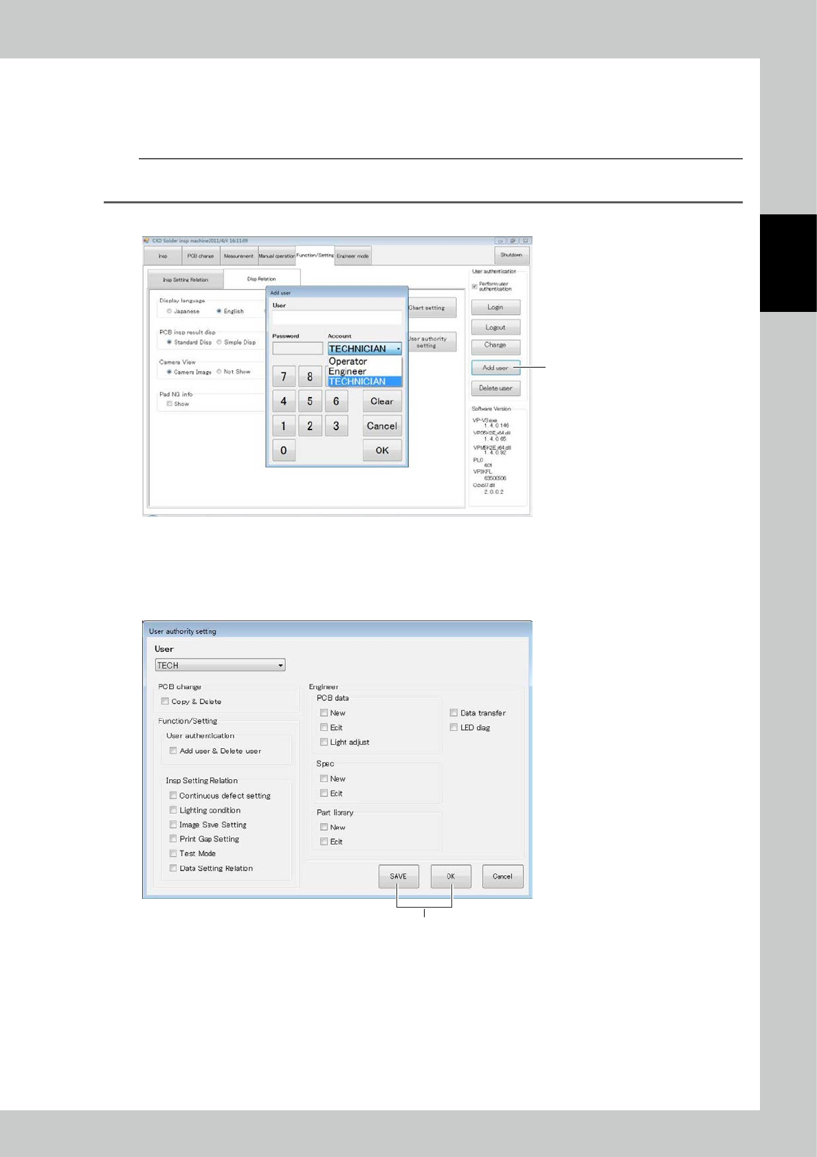 2. Log in with the engineer authority, and select the User authority setting button.
