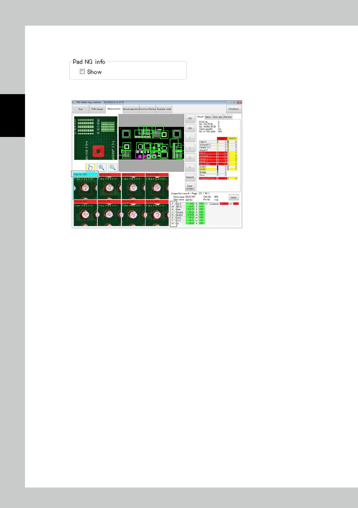 Place a check mark at Pad NG info Show to show NG and WARN data for the individual pad.