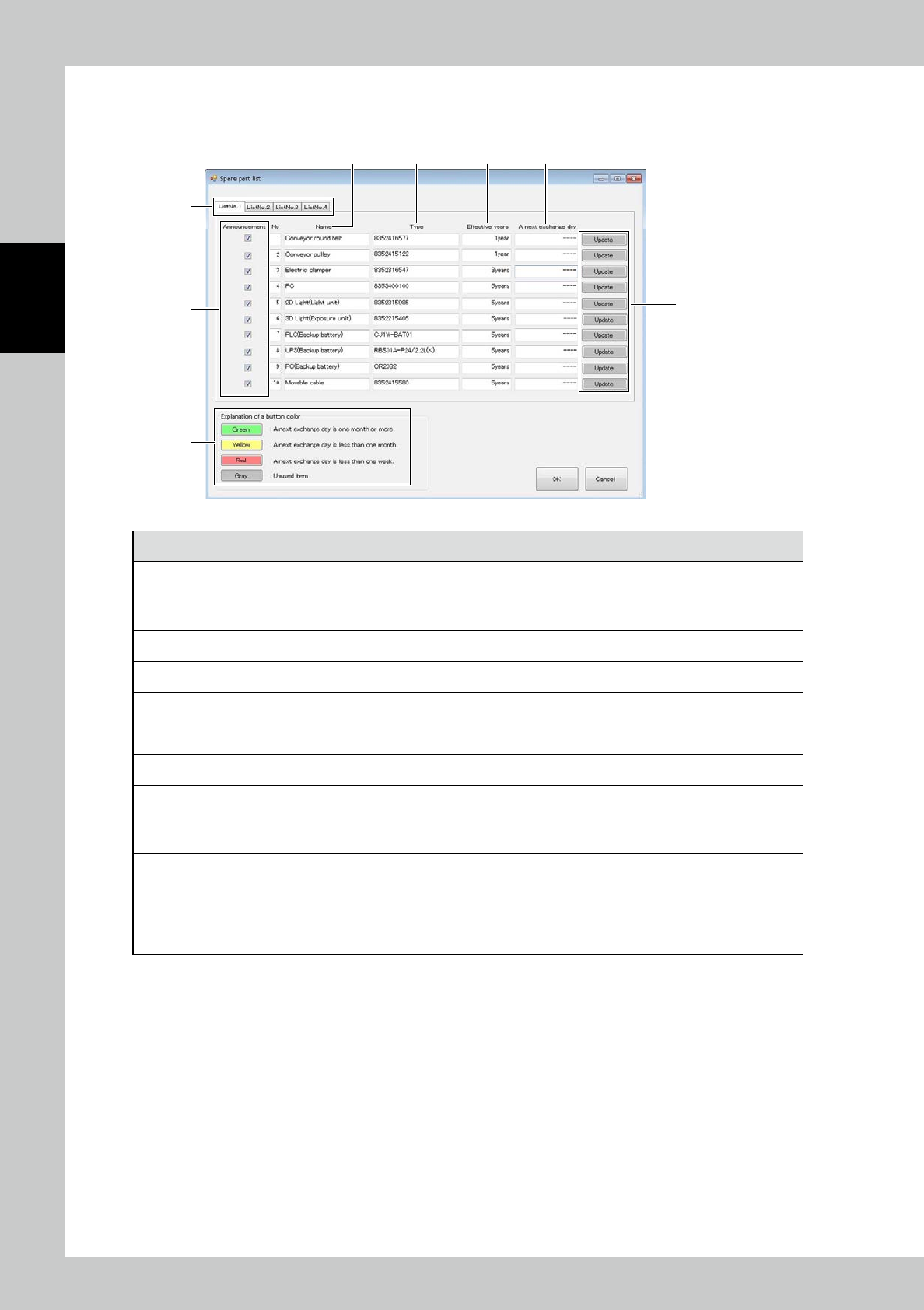 • List Tab1 : Displaying the registered parts from No. 1 to 10.