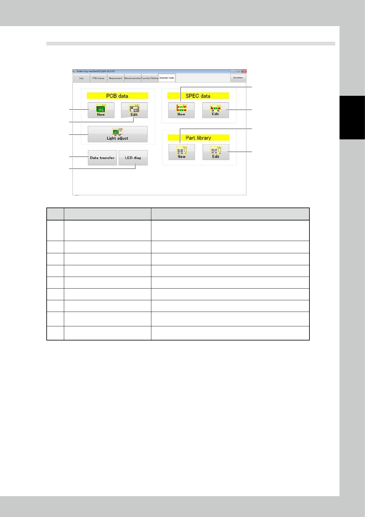 Items displayed on the engineer mode screen and functions are described. You can create or edit inspection