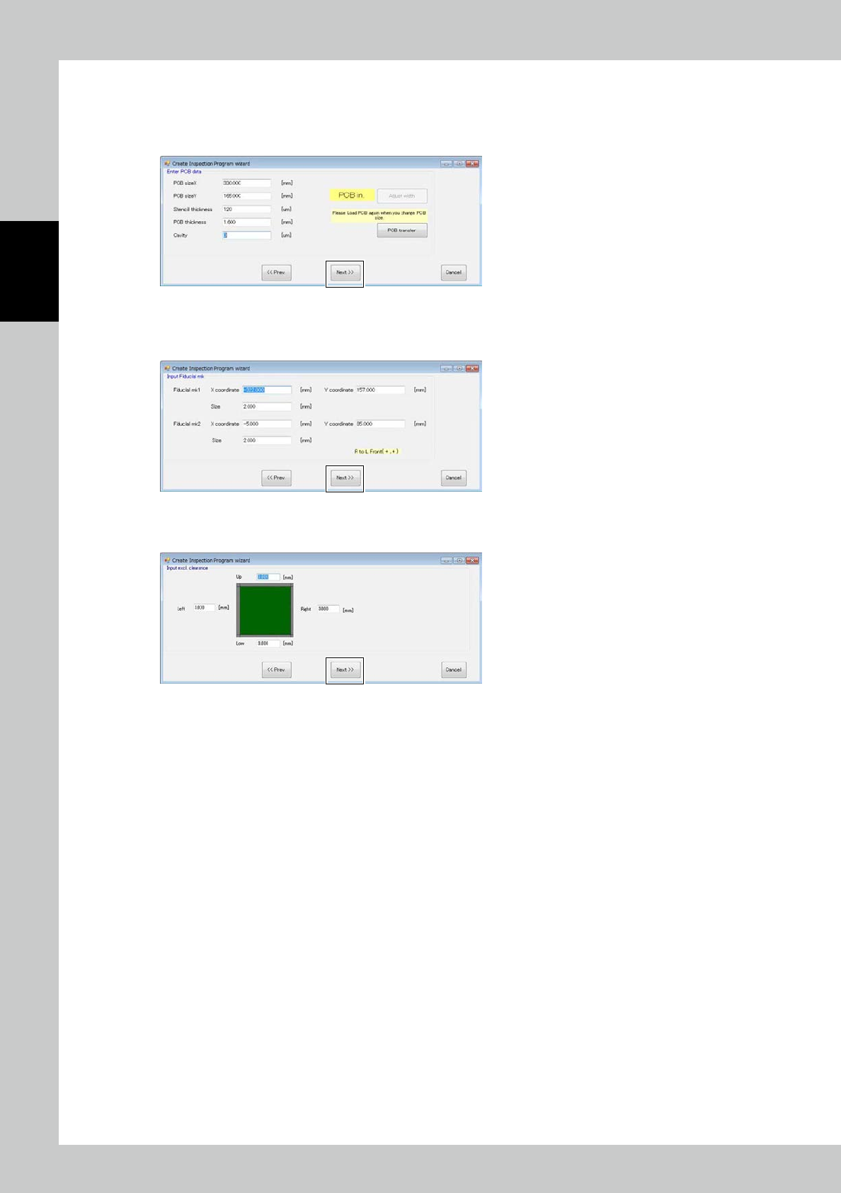 2-61 2 Operation Enter the pad recognition range v alues. Click on the [Next] button. 24284-KMN-00 T he image of the PCB is display ed. T he image shows the pad extraction range and the number of fields of view , based o…