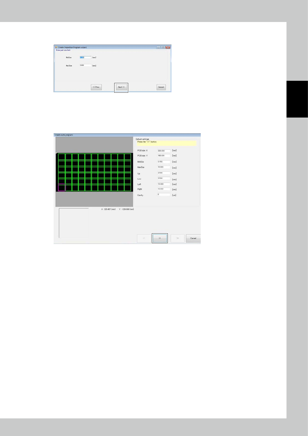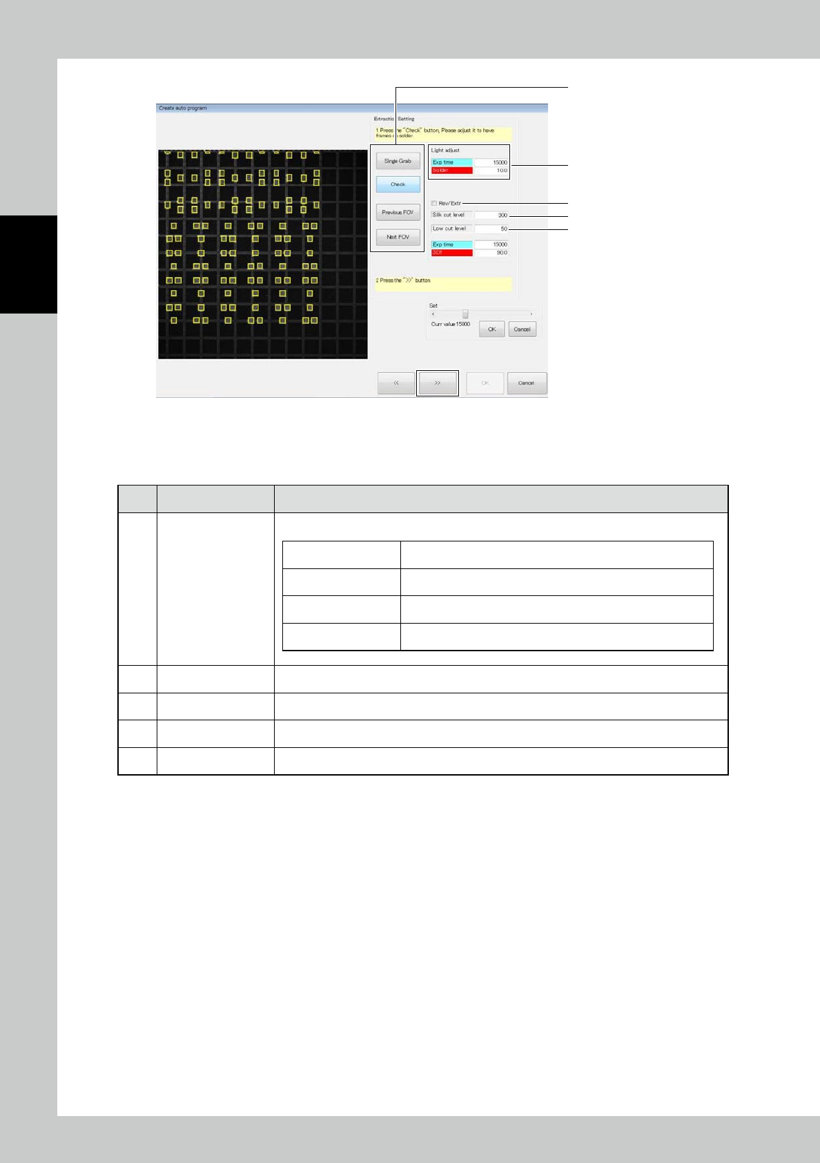 2-62 2 Operation 1 2 5 3 4 24286-KMN-00 Adjust the light intensity for solder e xtraction and click on the [>>] button. ■ Description of screen No Name Description of displayed item and functions 1 Buttons Use butt…