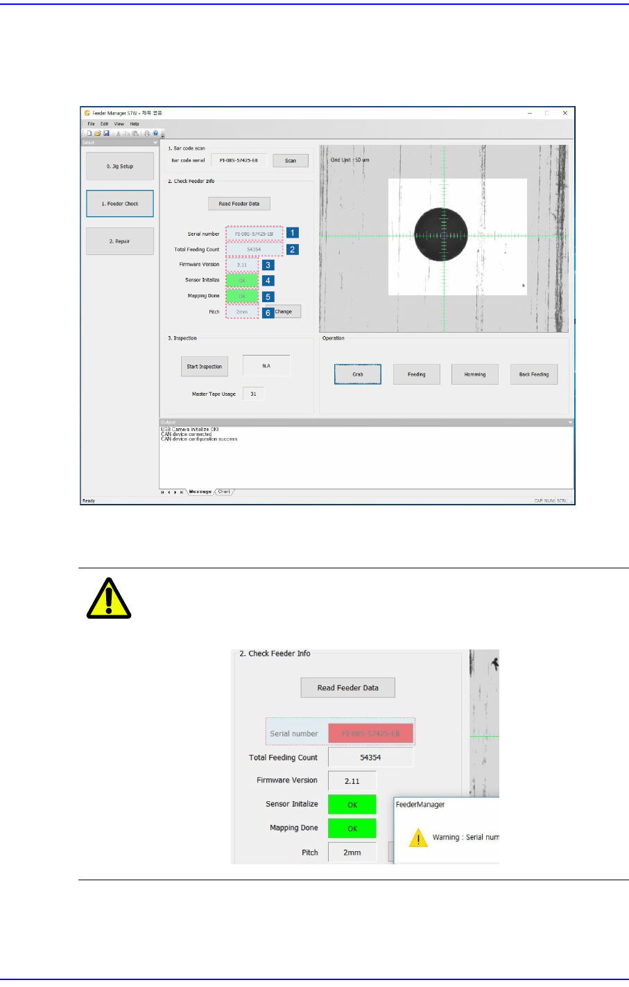 3-10 SME Tape Feeder Calibration Jig User's Manual 元件的供应精度检查结果为 “NG” 的话, 请修理 (Overhaul) 供料 器。 元件的供 应精度检查结果为 “OK” 的话, 继续使用该供料器到供料次 数达到 60,000,000 为止, 然后修理 (Overhaul) 该供料 器。 为 60,000,000 以上 把供料器的元件供应精度有关的 元件加以更换及修理 …