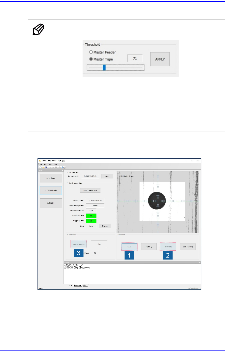3-15 校准带式供料器 觉系统识别主孔的位置。 便 笺 如果需要中止供料器的元件供应 精度检查, 请单击 <Stop Inspection> 按钮。 但, 中止检查的话供 料次数及检查结果将全部 初始化。 注 意 单击 <Grab> 按钮后视觉系统所识别 的供料器孔的位置不正确的 话可能会引起非常严重的问题。 请参阅 “3.2. 治具设置 ” 重新设置 带式供料器的原点。 7. 检查完毕后, 如下图所示 地在画…