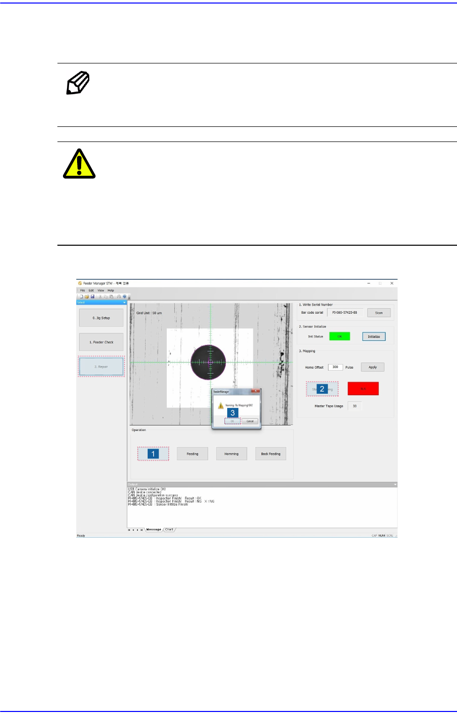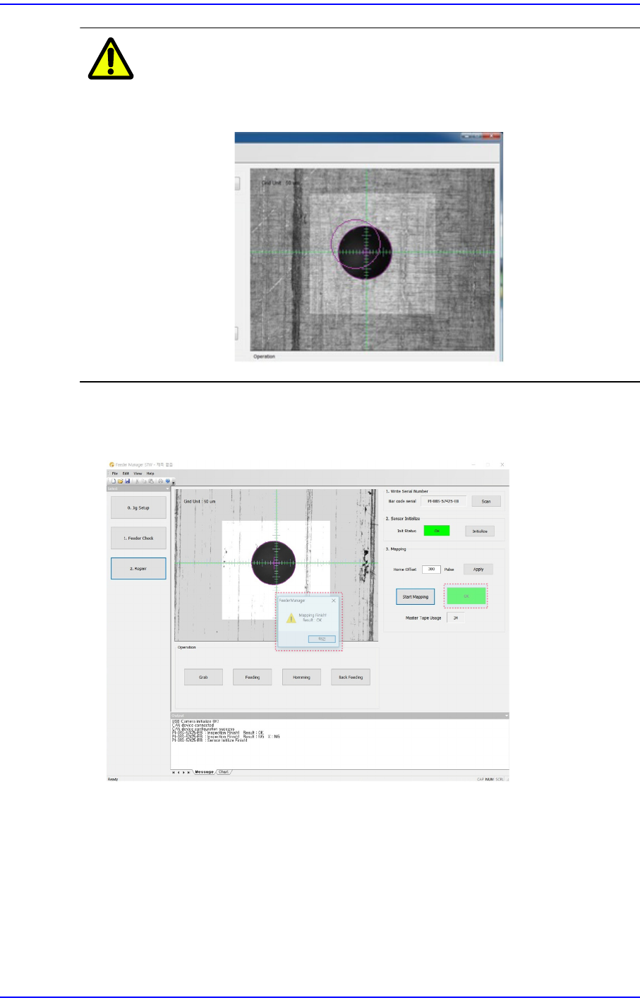 3-22 SME Tape Feeder Calibration Jig User's Manual <Apply> 按钮 如果需要适用 <Home Offset> 编辑框 上设置的偏移量, 请单击该按钮。 便 笺 视觉系统无法识别主料带的 孔时, 请参阅 “3.3.3. 供料器的元件供 应精度检查 ” 的 St e p 5 后设置 Threshold 值。 注 意 对于主料带的使用次数超过 (15…