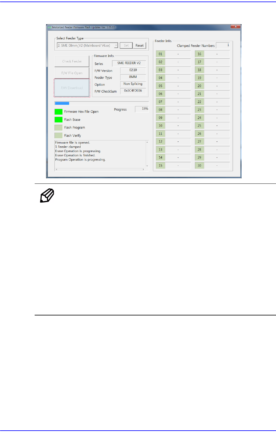 4-16 SME Tape Feeder Calibration Jig User's Manual 6. 单击 <F/W Download> 按钮实行固件升 级。 便 笺 根据固件升级进行情况如下 显示带式供料器的状态。 带式供料器的固件版本 为 2.xx Flash Erase : 带式供料器的状态 LED 以白色亮 灯 Flash Program : 带式供料器的状态 LED 以白色闪 烁 Flash V…