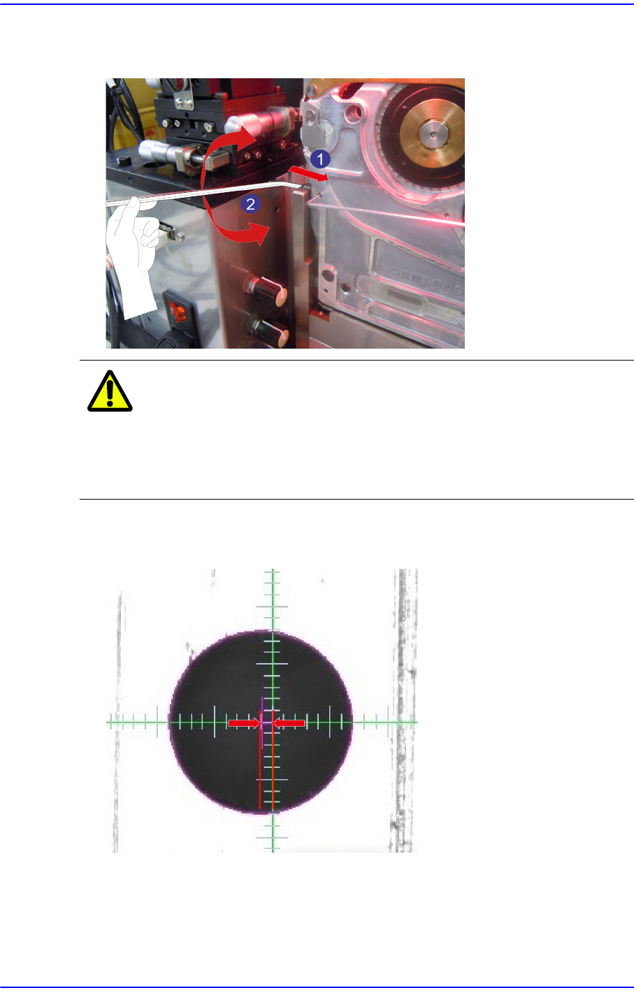 4. 调整X偏心销让视觉窗中主料带孔的中心与绿色十字线中心之间的间隔介于1