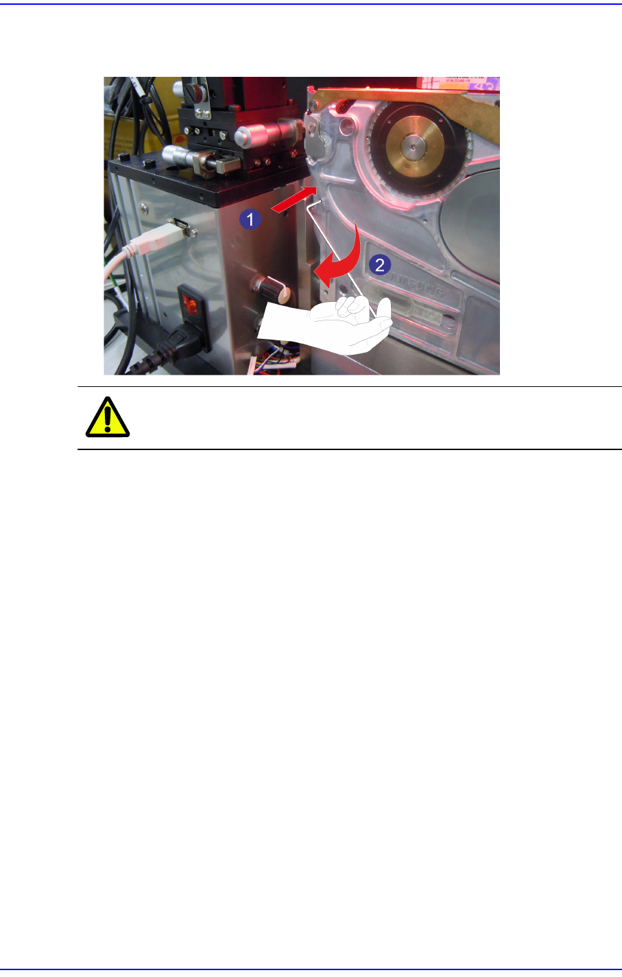 5-7 保养及维修 5. 把调整 X 偏心销时使用 的 2.5mm 扳手拿掉后, 在 Set Screw 插入 1.5mm 扳 手并且 往顺时针方向旋转扳手固定住 Set Screw 。 注 意 使用过多力量固定 Set Screw 的话, 可能会导致 Screw 受损。