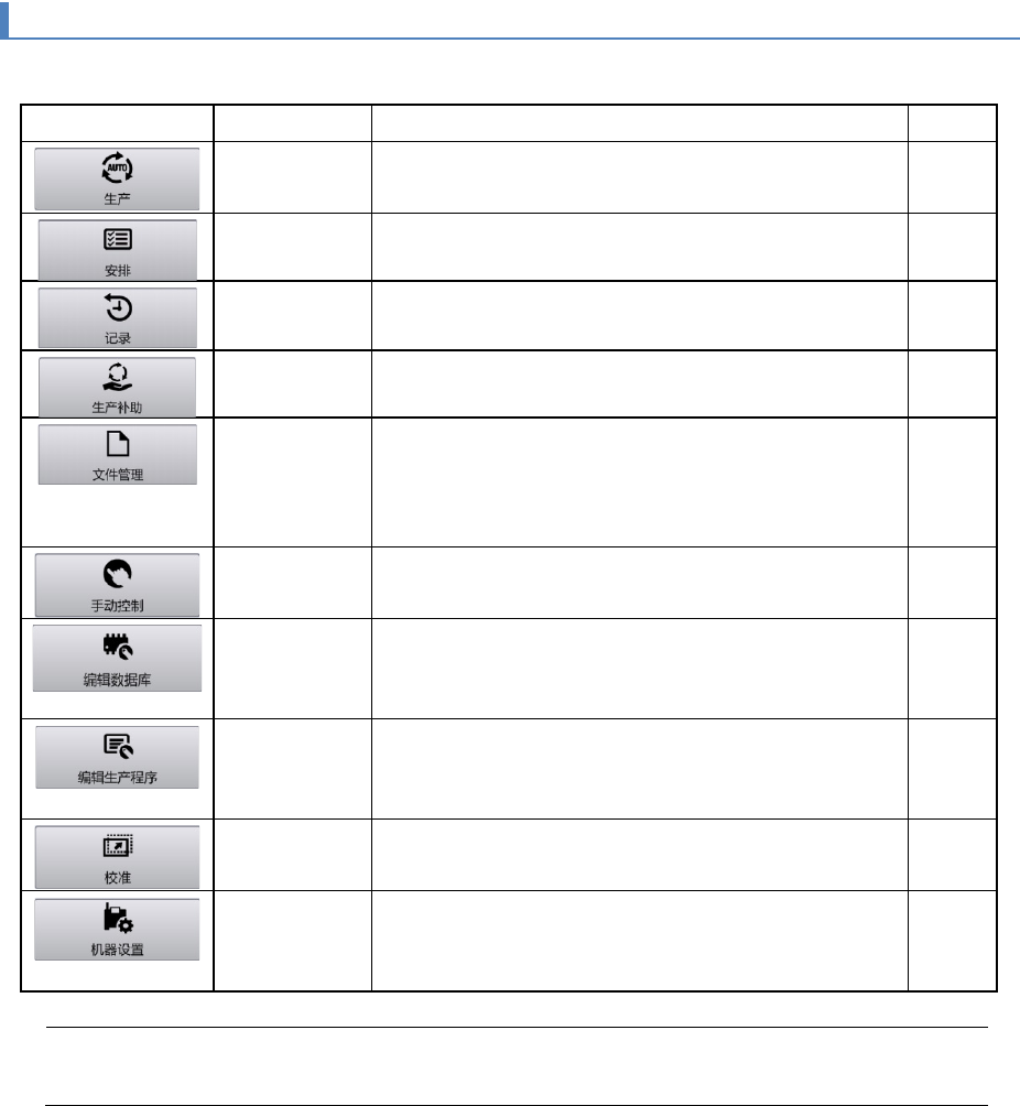 第 4 章 操作篇 4- 2. 操作画面构成 14 4-2- 3. 主菜单栏 显示各主菜单按 钮。 按钮 名称 说明 参考 生产 确认机器的生产 状况。 开始 / 结束生产。 4- 3. 安排 进行生产开始前 的生产程序 安排 作业。 4- 5. 记录 确认过去的操作 ,以及与错误有关的记录或 生产管理 信息。 4- 8. 生产补助 调出该功能,可 处理生产过程中发生的各种 问题。 4- 6. 文件管理 对 [ 编辑生产程 序 ] 菜单…