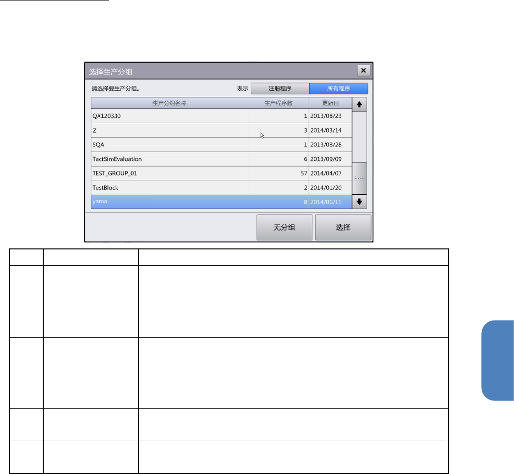 第 4 章 操作篇 4- 3. 生产 25 4 支援准备对话框的详情 [ 生产分组选择 ] 对话框 选择 / 解除 生产时使 用的 生产分组。 触摸 生产分组名称的文本框, 将显示 [ 选择生产分组 ] 对话 框。 记号 名称 说明 (a) 表示 选择要在画面中 显示的生产分组名称列表的 种类。 • 注册 程序:显示包括 已在 [ 程序注册 ] 菜单中注册的生产程 序在内 的生产分组名称 列表。 • 所有 程序:显示所有的生产分 组…