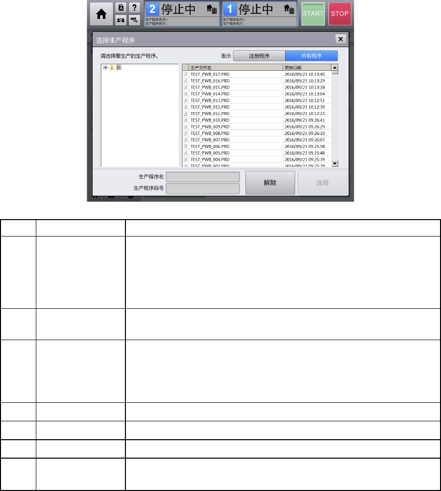生产程序名列表 列表显示可选择的生产程序的信息。