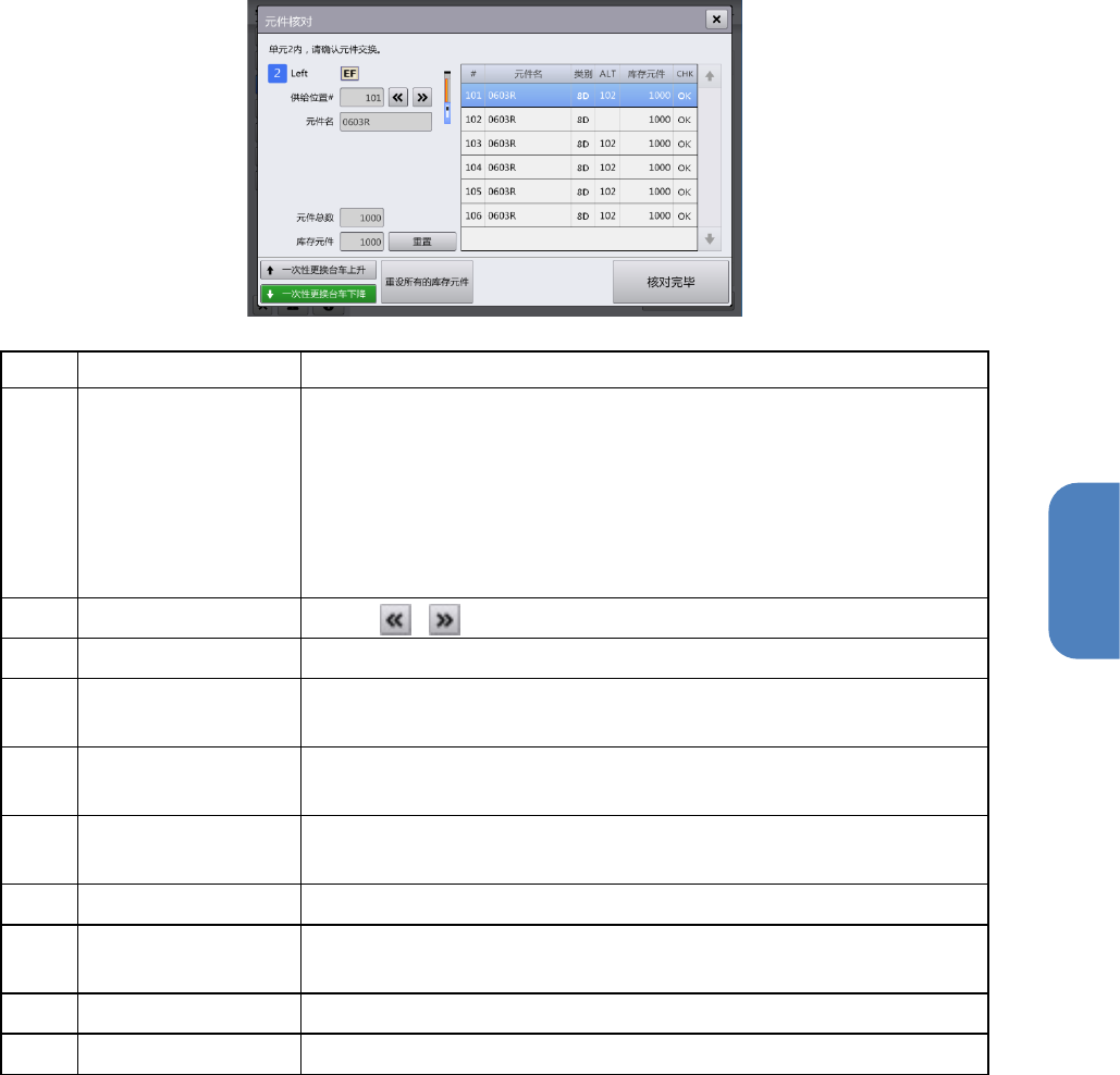 确认一次性更换台车上升后,完成元件核对作业,关闭对话框。