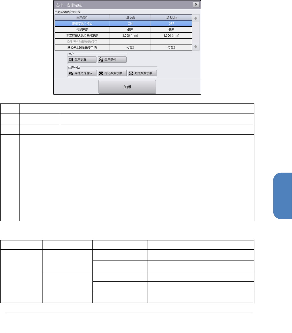 第 4 章 操作篇 4- 3. 生产 37 4 [ 安排 : 安排 完成 ] 对话框 在 [ 支援准备 ] 菜单中触摸 [ 自动执行 ] 后,如果安排的全部工序都完成,将显示 [ 安排:安排完成 ] 对话框 。 记号 名称 说明 (a) 画面切换按钮 完成所有 的支援准备,切换为对应的 画面显示。 (b) 关闭 完成所有的支援 准备,返回 [ 支援准备 ] 画面的显示。 (c) 生产条件 显示贴片精度等 影响生产节拍的生产条件。 •…