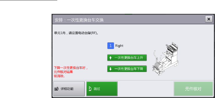 3 更换一次性更换台车后,(一次性更换台车不上升)触摸[元件核对],显示[安排:核对元件]。