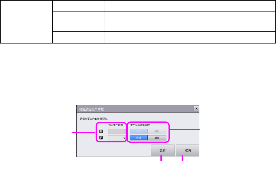 预定生产片数 输入设定的生产片数。如果输入 0,则表示无限制,不会自动停止。