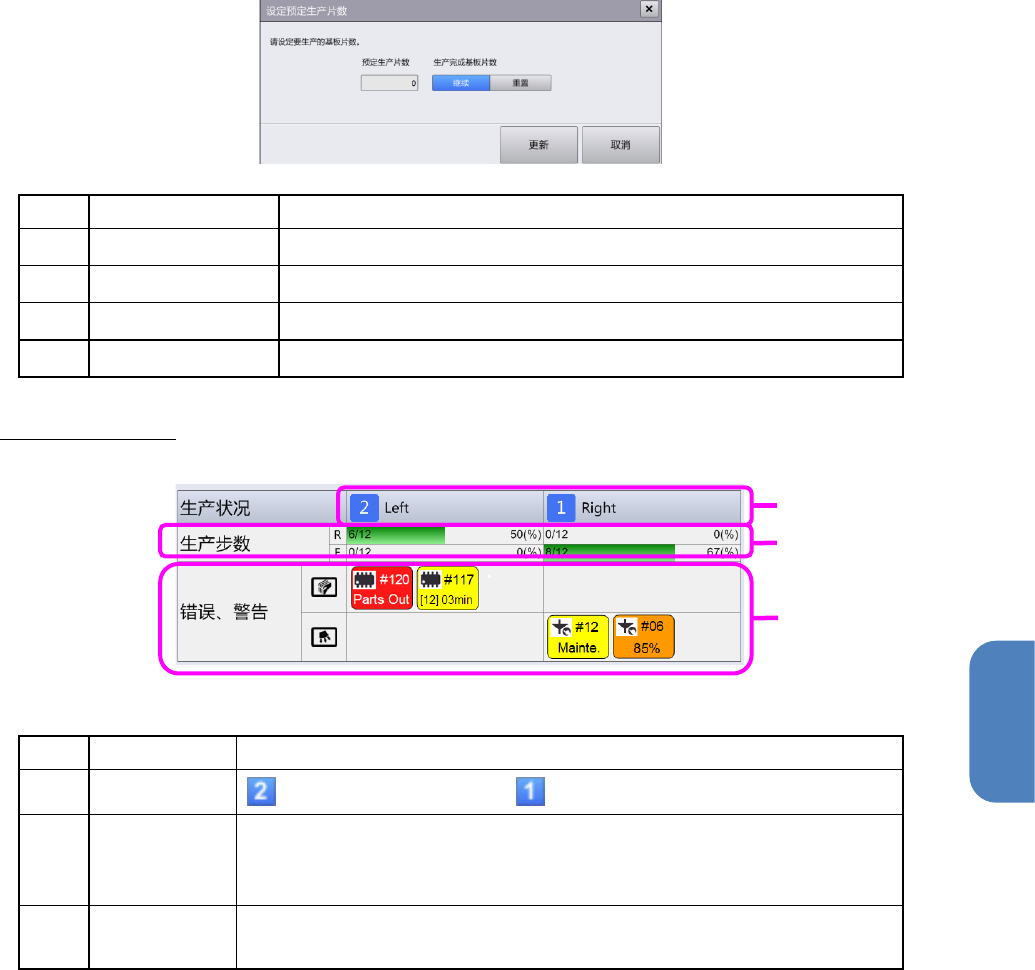 第 4 章 操作篇 4- 3. 生产 44 生产片数(试打片数 / 空打 片数) 显示当前正在生 产的生产程序中生产片数和 生产预定片数。 在前后 通道 中生产时,用 1 行显示各自的生 产片数和生产预定 片数 。 对应运转模式的 选择,显示各模式下分别计 算的 生产 片数。 生产电路数( 试打电 路数/空打 电路 ) 显示当前生产中 的生产程序已生产的基板上 的电路数。 对应运转模式的 选择,显示各模式下分别计 算的已生产电路…