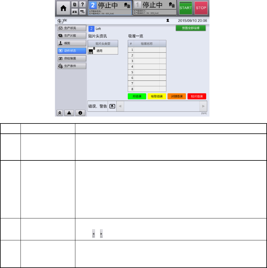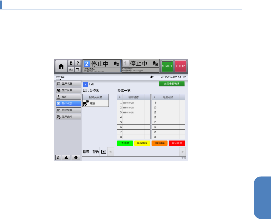 在[动作状态]画面中,可确认共通面板中选择的,生产中单元内的贴片头运行状况,错误状况,警告状况。