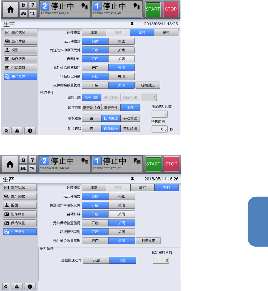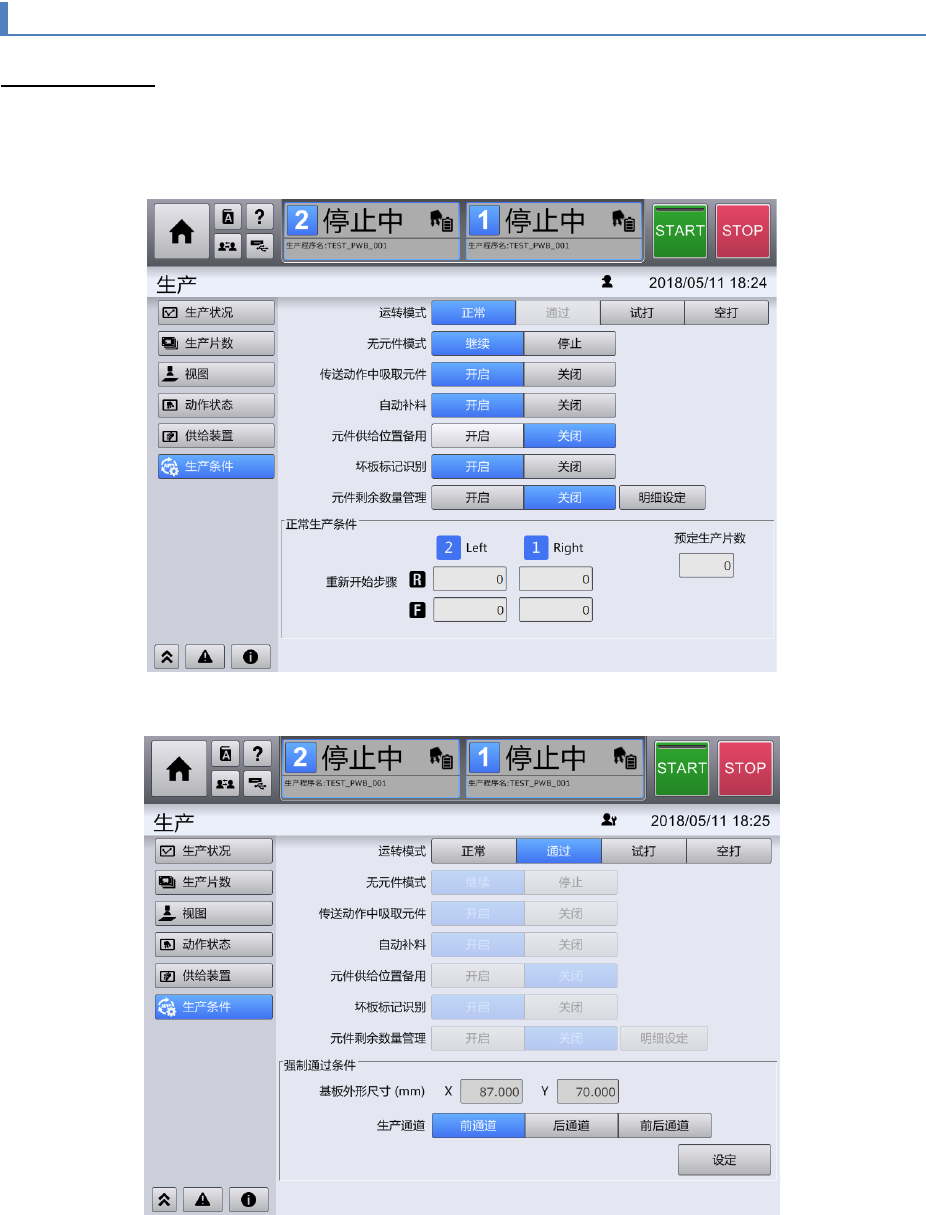 第 4 章 操作篇 4- 3. 生产 56 4-3- 8. 生产条件 生产模式的设定 触摸 [ 生产 ] 画面 子菜单面板中的 [ 生产 条件 ] ,显示 [ 生产 条件 ] 画面。 运转模式为 [ 正常 ] 时 运转模式为 [ 通过 ] 时