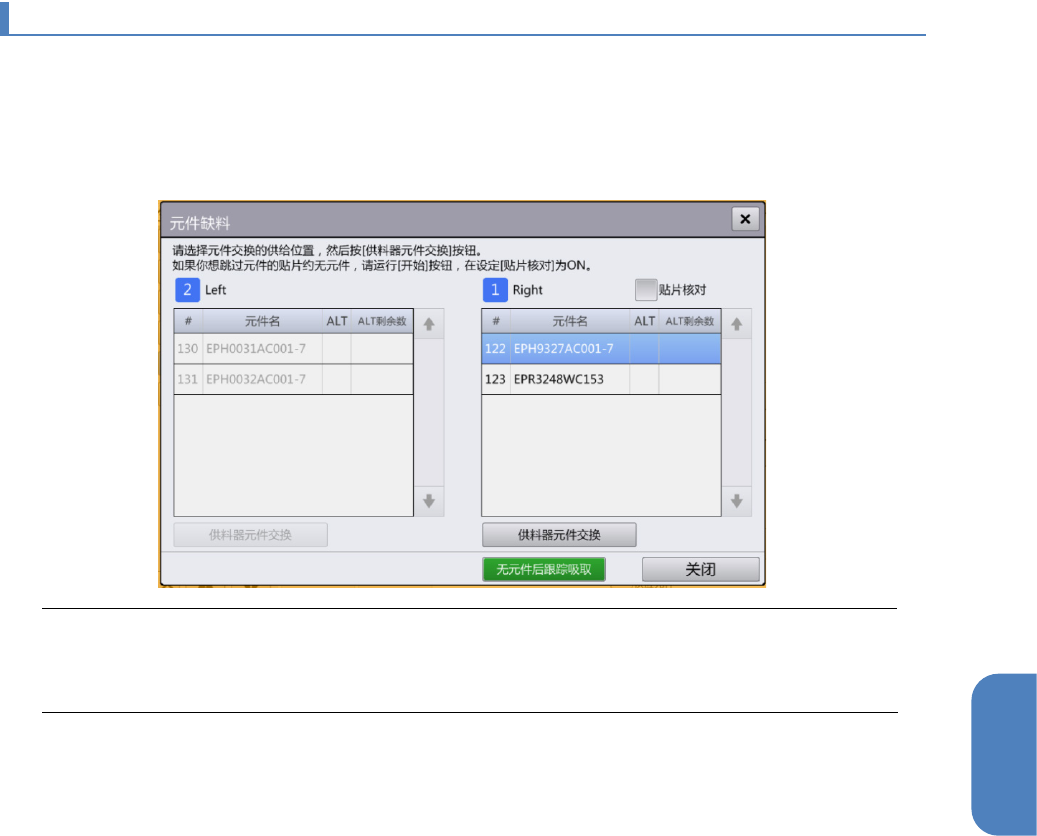 如果生产条件的[元件缺料模式]设定为继续,[元件缺料]对话框中会显示[忽略贴片]复选框。