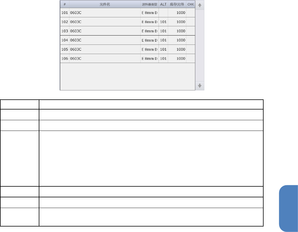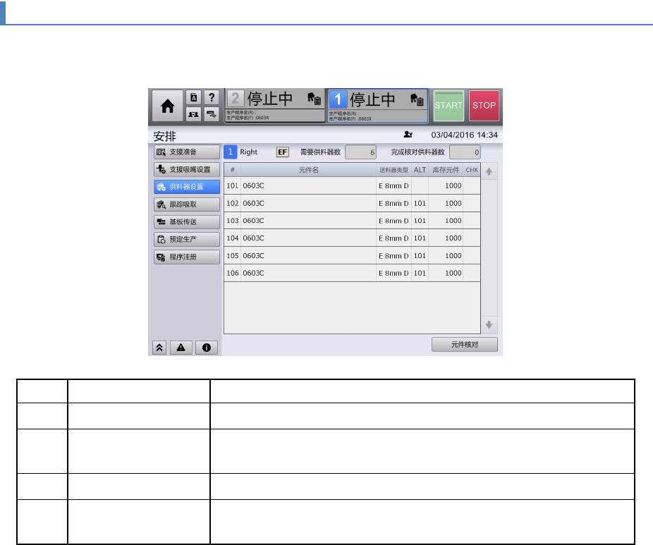 第 4 章 操作篇 4- 5. 安排 93 4 供给部 列表 显示 说明 # 显示供给位置编 号。 元件 名 显示生产时所用 元件的元件名。 送料器类型 显 示所用带式供料器的种类。 • E 8mm S:8mm 单轨送料器 (EF 系列 ) • E 8mm D: 8mm 双轨送料器 (EF 系列 ) • E 12mm ~ E 32mm:12mm ~ 32m m ( EF 系列 ) • E 4mm:4 mm (EF 系列 )( 注 1…
