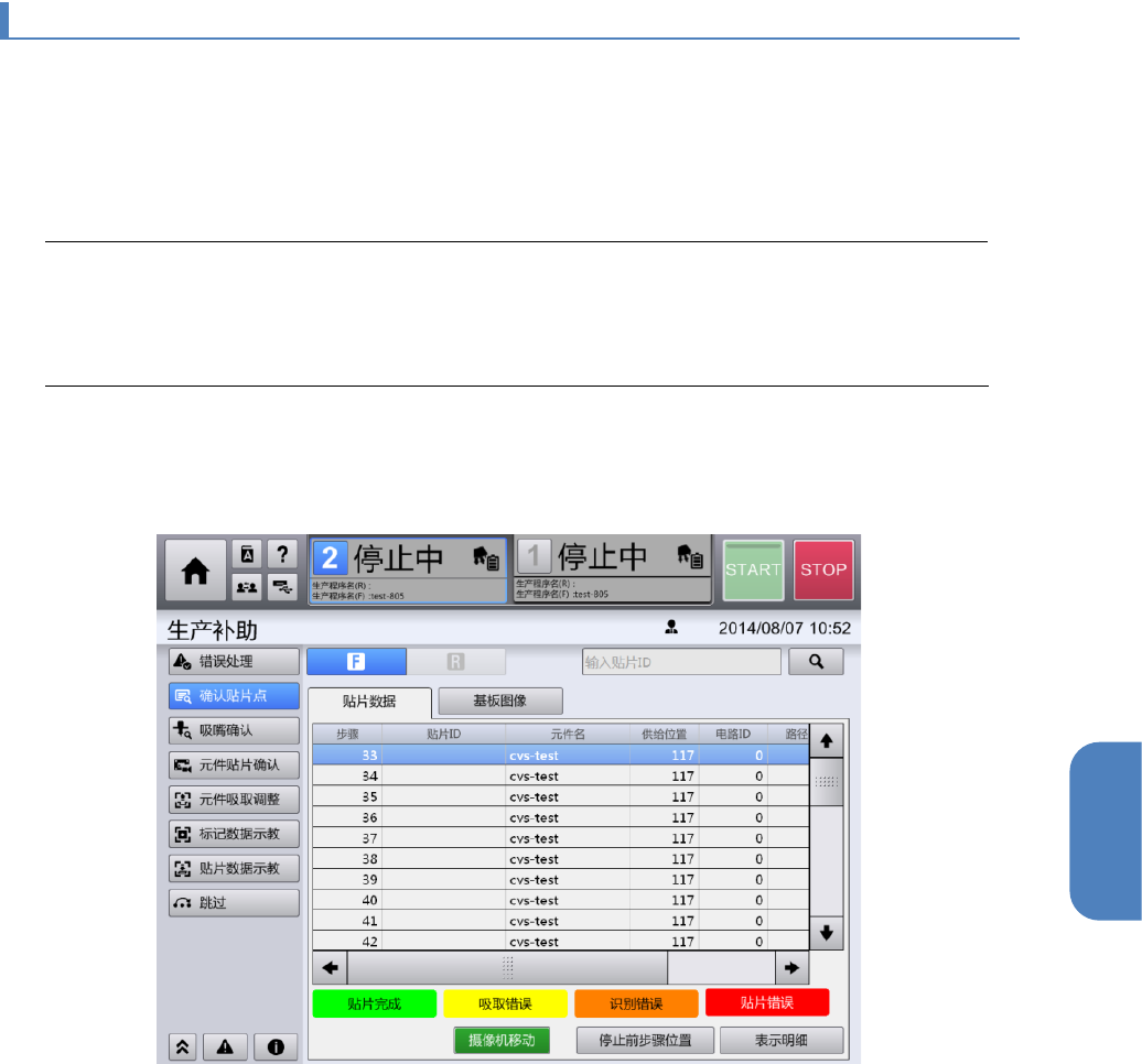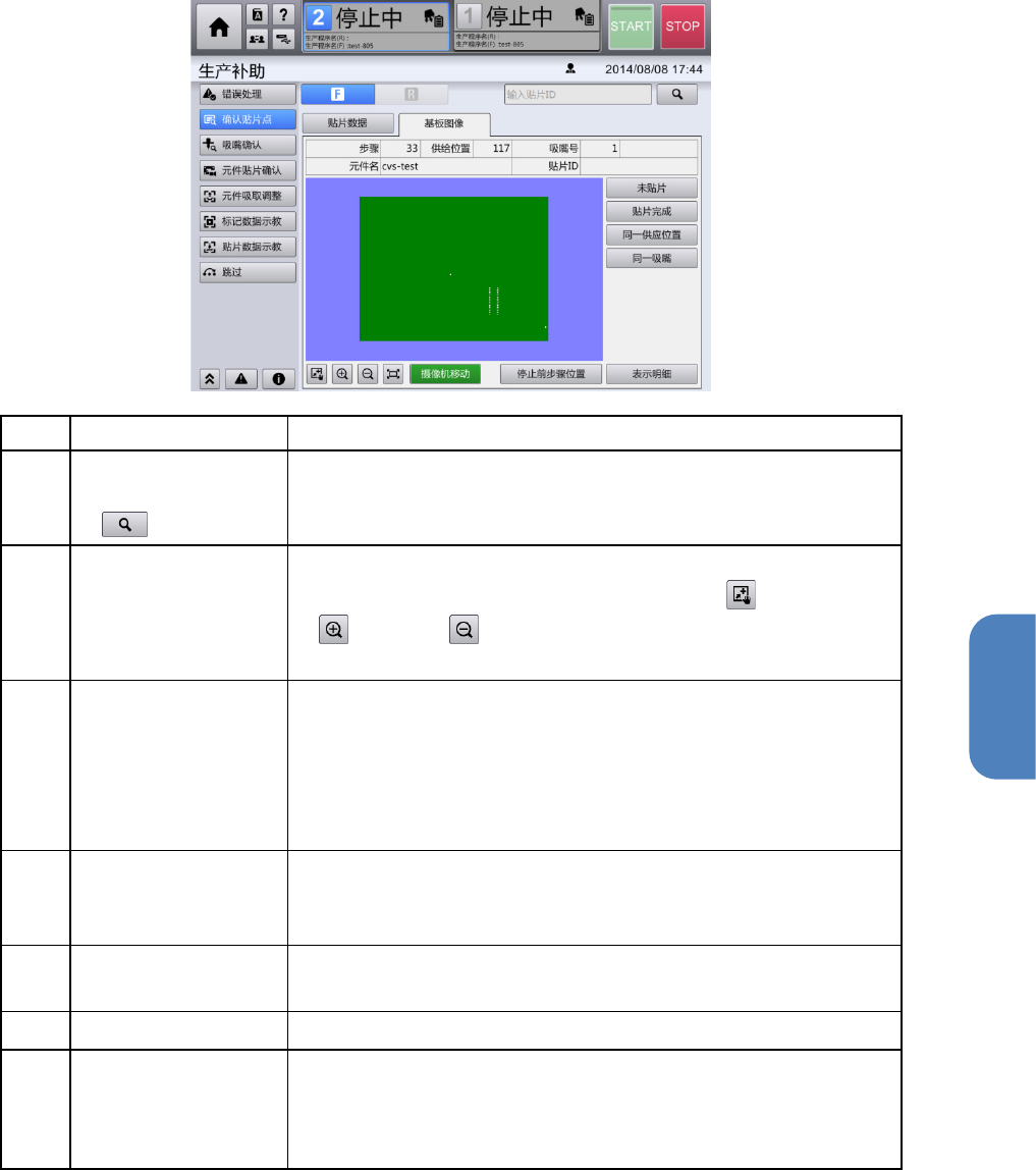第 4 章 操作篇 4- 6. 生产补助 102 记号 名称 说明 (a) 贴片 ID 搜索文本框 / 贴片 ID 搜索按钮 ( ) 以贴片 ID 为关键字,从选择 的步骤中搜索数据(部分 搜索 * )。存在 匹配数据时,将 把贴片数据列表中对应的行 变为选择状态。 * 可以只使用贴片 ID 的一部分 搜索。 (b) 贴片 数据列表 列表显示 对象 单元 及 通道 上正在生产 的贴片数据。 • 步骤 :显示贴片步骤编号。 • 贴片 ID…