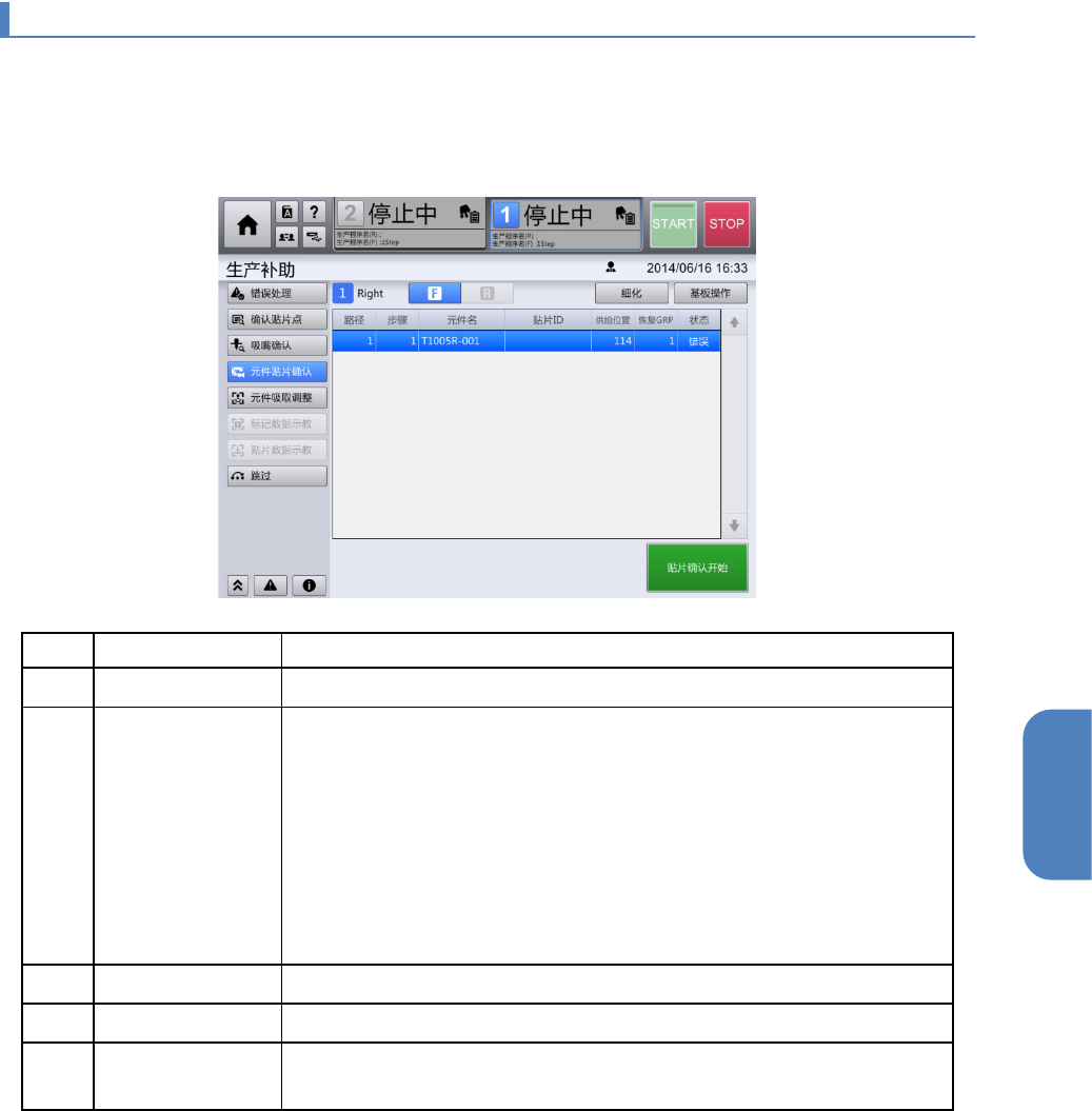 在[元件贴片确认]画面中,可对机器上正在生产的基板,用 OCC 确认是否有未贴片元件的步骤,针对未