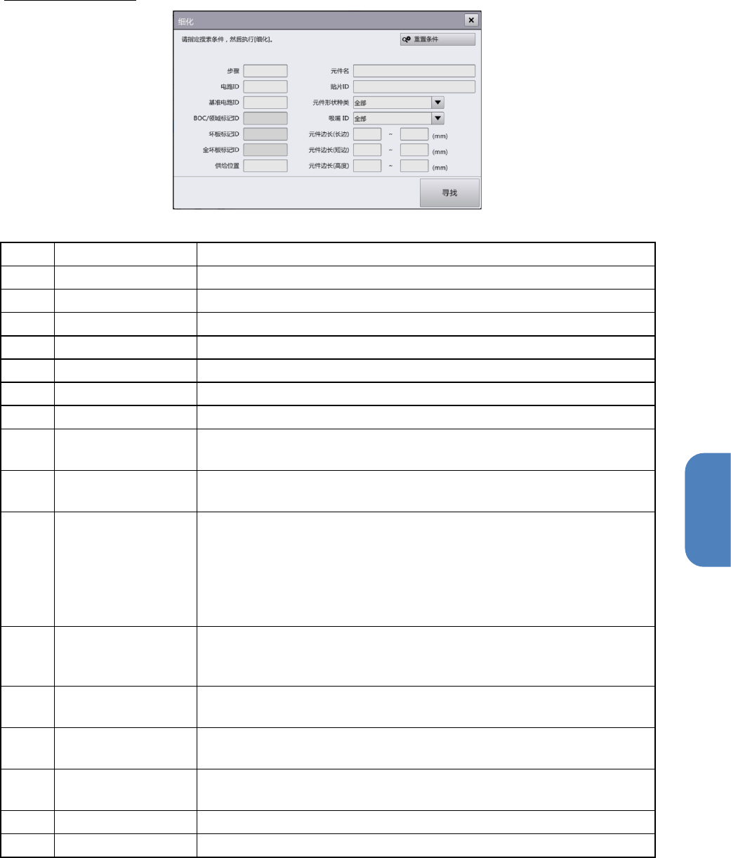 第 4 章 操作篇 4- 6. 生产补助 116 1 触摸共通面板的单元按钮,选择正在生产贴片 确认对象基板的单元。 2 触摸 F/R ,选择通道。 3 触摸 [ 细化 ] ,显示 [ 细化 ] 对话框。 有关 [ 细化 ] 对话 框的详情,请参阅下述的「 细化对话框的详情」。 4 在 [ 细化 ] 对话框中设定各个项目,触摸 [ 搜索 ] 。 将在 贴片步骤列表中显示的 贴片 步骤数据中 细化。 5 从贴片步骤列表中选择要进行贴片确认…