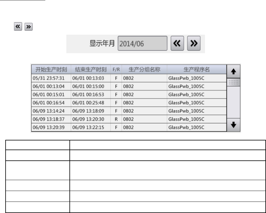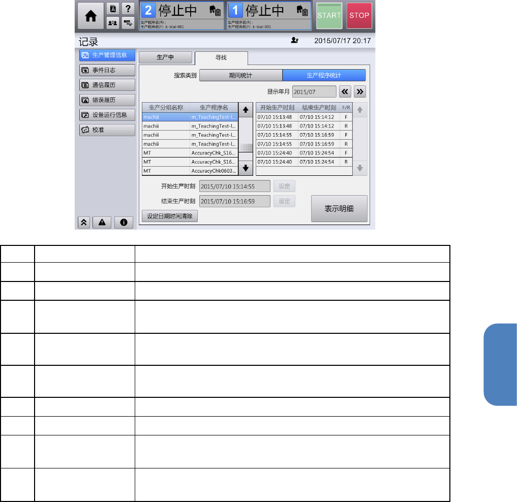 第 4 章 操作篇 4- 8. 记录 162 生产批次的切换 触摸 [ 生产管理信息 ] 画面中的 [ 寻找 ] - [ 期间统计 ] - [ 显示年 月 ] ,或按 [ 寻找 ] - [ 生产 程序 统计 ] - [ 显示年月 ] 的 顺序触摸,可显 示每个月的数据。 触摸 / 可 更改显示。 [ 寻找 ] - [ 期间统计 ] 中的生产管 理信息列表 名称 说明 开始 生产时刻 开始统计 生产管理信息的时间 结束 生产时刻 结束统计…