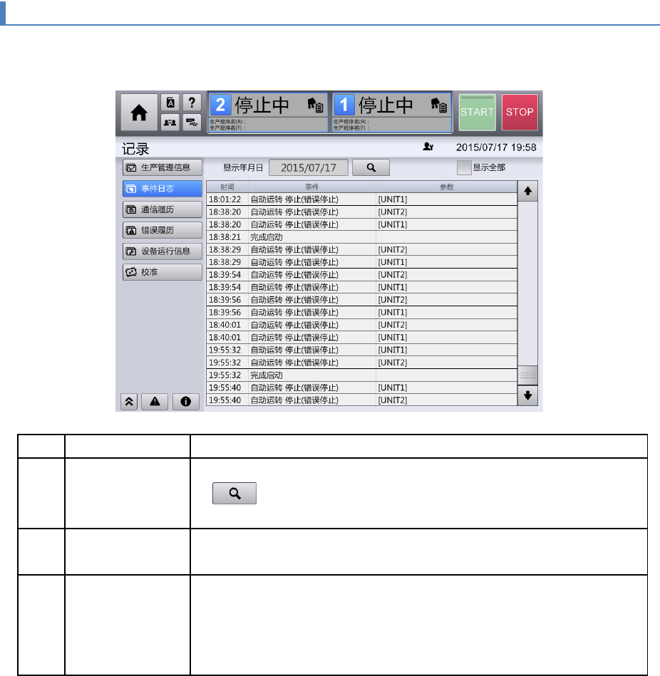 事件:显示机器的启动,结束,生产程序切换等用户操作信息,