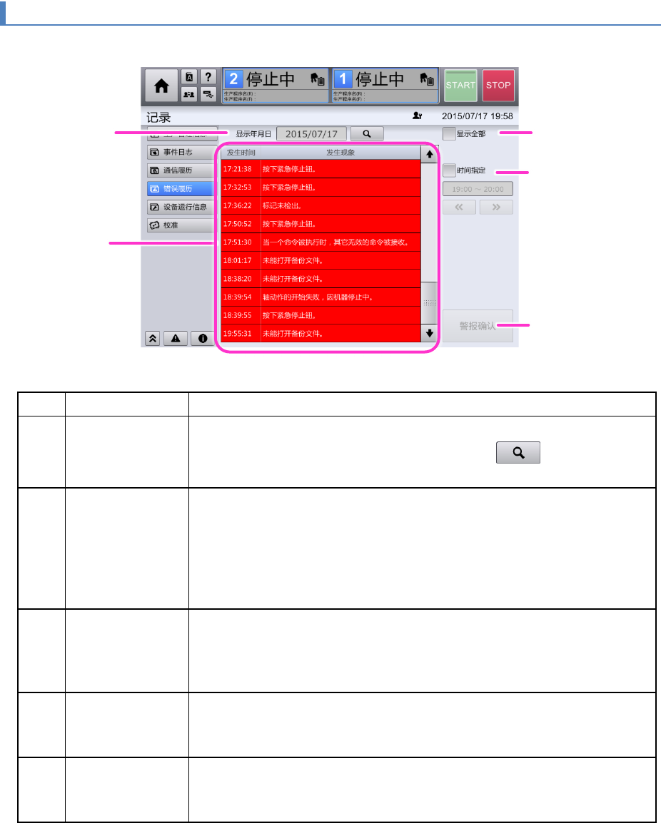 触摸[记录]菜单的[错误履历],即显示[错误履历]画面。