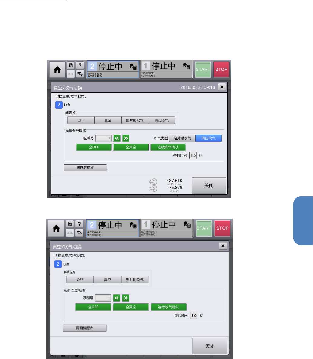 第 4 章 操作篇 4- 9. 手动控制 185 4 贴片头气体的切换操作 切换当前贴片位 置上的吸嘴气压。 1 触摸 [ 贴片头控制 ] 画面的 [ VAC ] 。 显示 [ 真空 / 吹气 切换 ] 对话框。 贴片头类型为高速时 贴片头类型为通用时