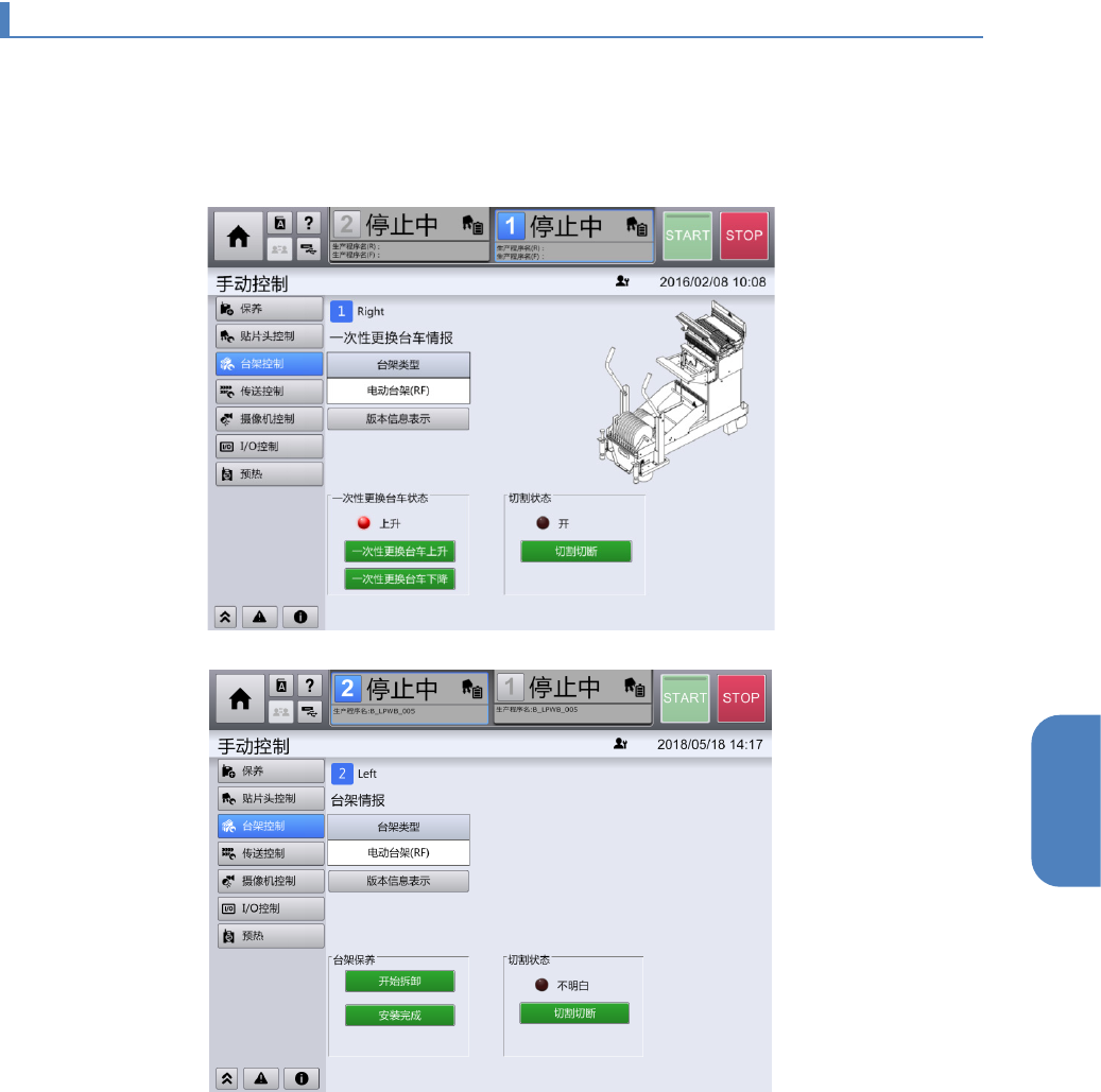 在顶部菜单中按[手动控制] - [台架控制]的顺序触摸后,将显示[台架控制]画面。