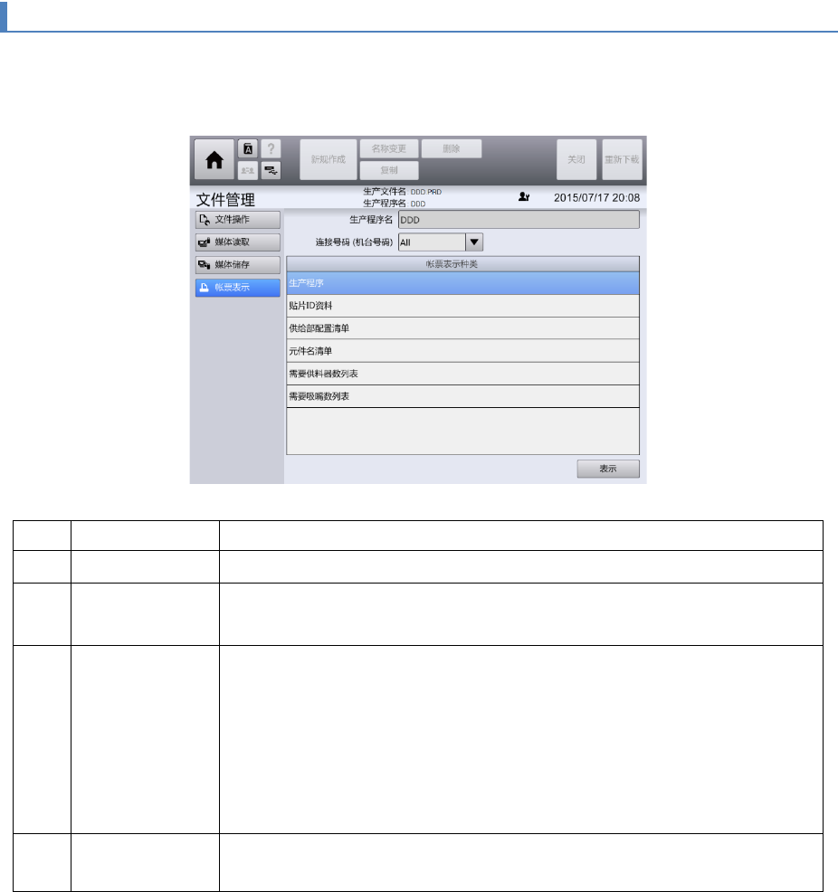在画面中显示通过[文件操作] 画面打开的生产程序的账票数据(文件数据)。可将账票数据输出到 USB