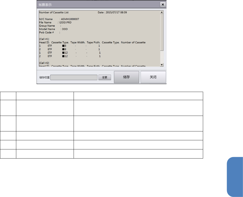 第 4 章 操作篇 4- 10. 文件管理 217 4 账票的显示示例 记号 名称 说明 (a) 账票数据(文件 数据) 显示 账票数据( 文件数据)。 不能编辑。 (b) 存储位置 显示将账票数据 (文件数据)保存到 USB 存储设备时的 存储位置路径。 (c) 变更 变更存储位置文 件夹。 (d) 存储 将账票数据(文 件数 据) 保存到 USB 存储设 备中。 (e) 关闭 关闭对话框。