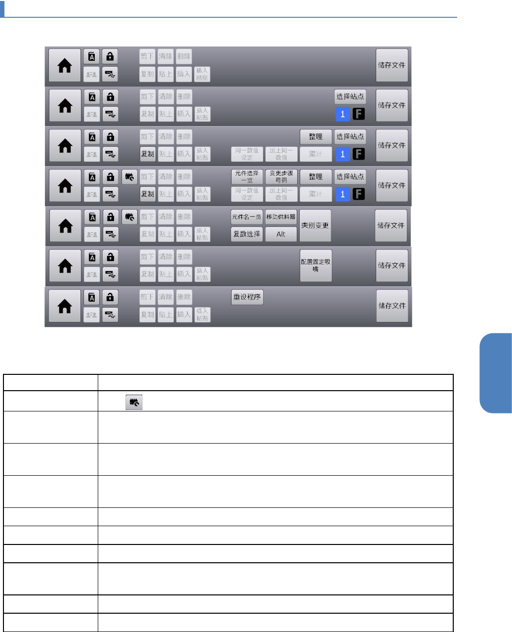第 4 章 操作篇 4- 11. 编辑生产程序 220 名称 说明 整理 指定优先顺序, 对表格进行排序。 选择站点 要通过按 [T ] 按钮 或 [S] 按钮 对 实际基板上的位置或参数进 行示教时, 必须 选择 要放置 基板 的 站点 。 在按钮的下侧显 示当前选择的站点位置(单 元编号 [1 ] 或 [2] 、以及 通道号 [F] 或 [R] )。 装置处于基板 生产 过程中,不 能使用此项。 同一数值设定 将选中单元格中 的字符…