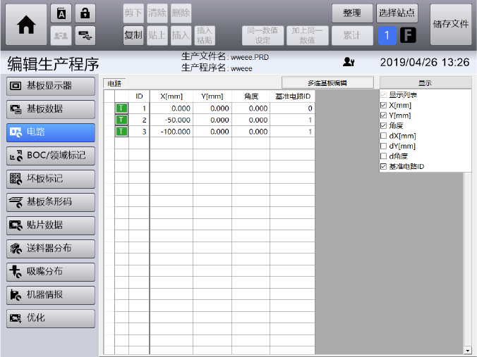 在[编辑生产程序]菜单画面的[电路]、[BOC 领域标记]、[坏板标记]、[基板代码]、[贴片
