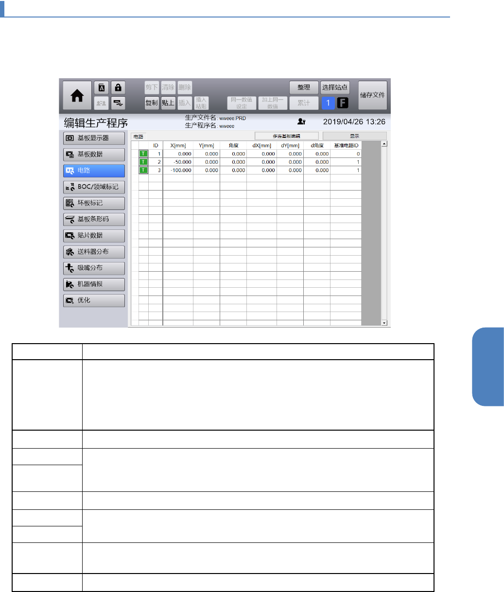 触摸[编辑生产程序]菜单画面左侧的子菜单面板中的[电路],显示[电路]画面。