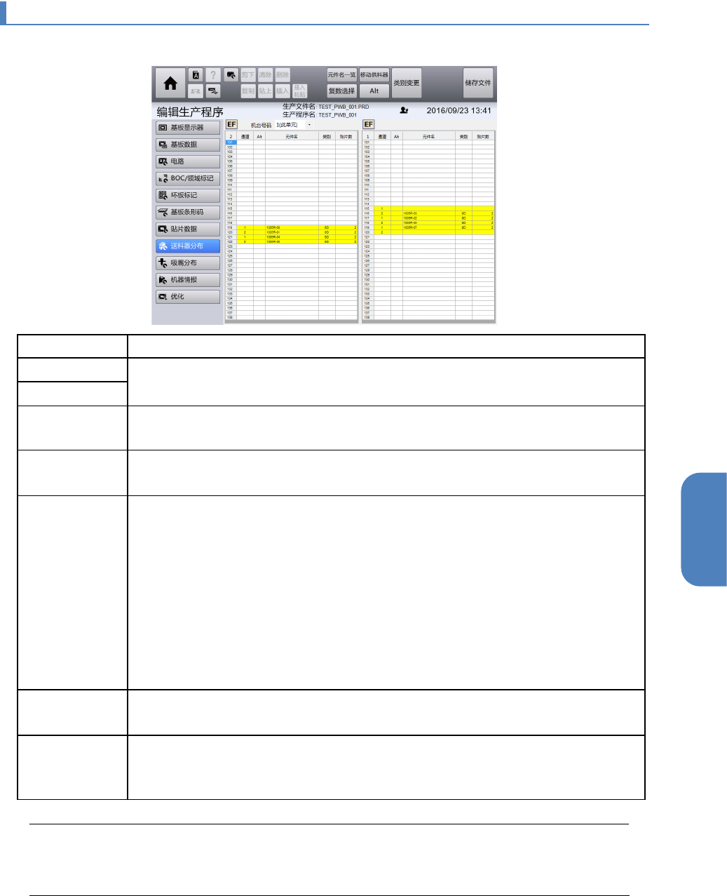 第 4 章 操作篇 4- 11. 编辑生产程序 250 机台号码 对编辑送料器分 布的机台号码进行设定。通 常不 需要 编辑。 元件颜色说明 显示配置元件的 颜色说明。 制作 AL T (元件供给位置备 用) 1 从供应部列表选择制作 AL T (元件供给位置备用) 的供 应 装置的供应位置编号 。 2 触摸共通面板的 [ Alt ] 。 3 选择供应部列表的要制作 ALT (元件供给位置备用 )供给位置备用 的 供应位置 …