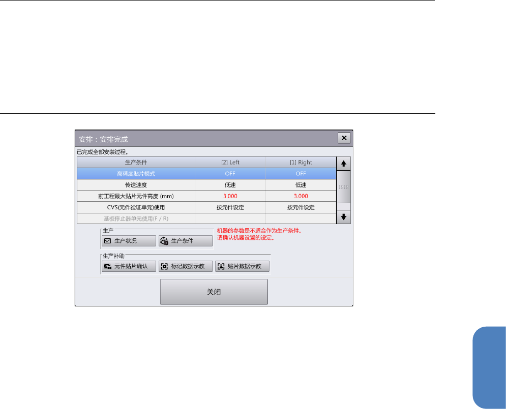 第 4 章 操作篇 4- 11. 编辑生产程序 263 4 注意 前工序最大已贴 片元件高度的值,要在[机 器设置]菜单的[装置设定 ]画面中设定。[装置 设置]画面中的 设定,用于在[优化]画面 中实施优化时,决定元件贴 片顺序,以及在装置中 进行实际生产时 决定 Z 轴的初始高度。 在机器设置与生 产程序的设定中,机器设置 的 Z 轴高度比[前工 程最大已贴片元件高度]计 算 得出的 Z 轴高度更高时 ,实际动作的工效比生产…