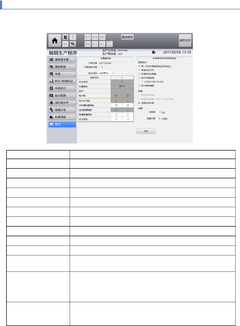 触摸[编辑生产程序]菜单画面左侧的子菜单面板中的[优化],显示[优化]画面。