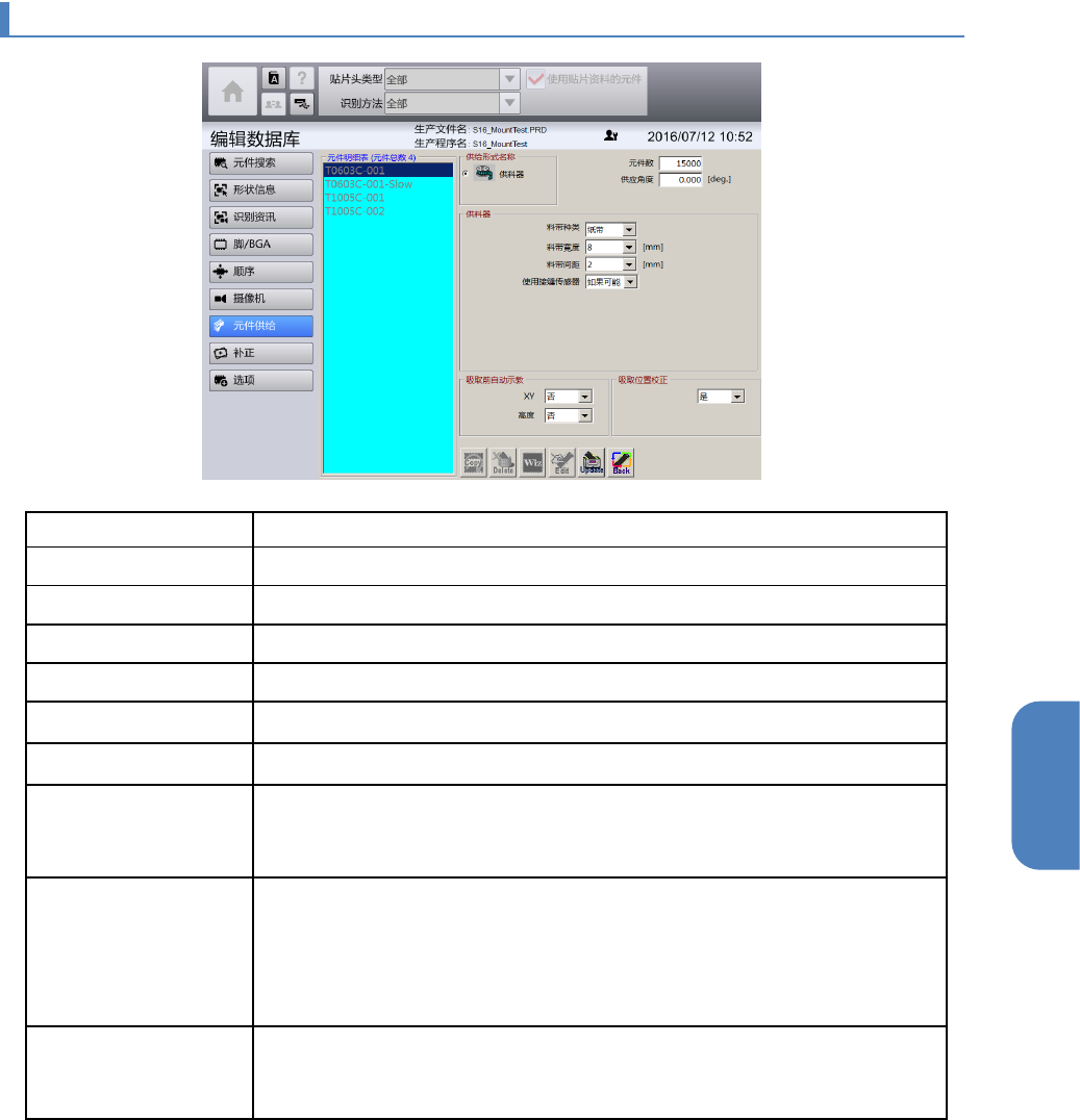 第 4 章 操作篇 4- 12. 编辑数据库 283 4 4- 12 - 8. 元件供给资讯的画面 项目名称 说明 供给形式 选择供给形态。 元件数 输入 新品的元件 中收纳的元件个数。 供应角度 输入 元件的供应角度。从上方 看反时针方向为正方向。 料带种类 从 [ 纸带 ] , [ 胶带 ] 中选择料带的材质。 料带宽度 选择料带的宽度。 料带间距 选择料带上的 元件 间隔。 使用接缝传感器 选择在接缝(搭 接)的检测中是否使用接缝…