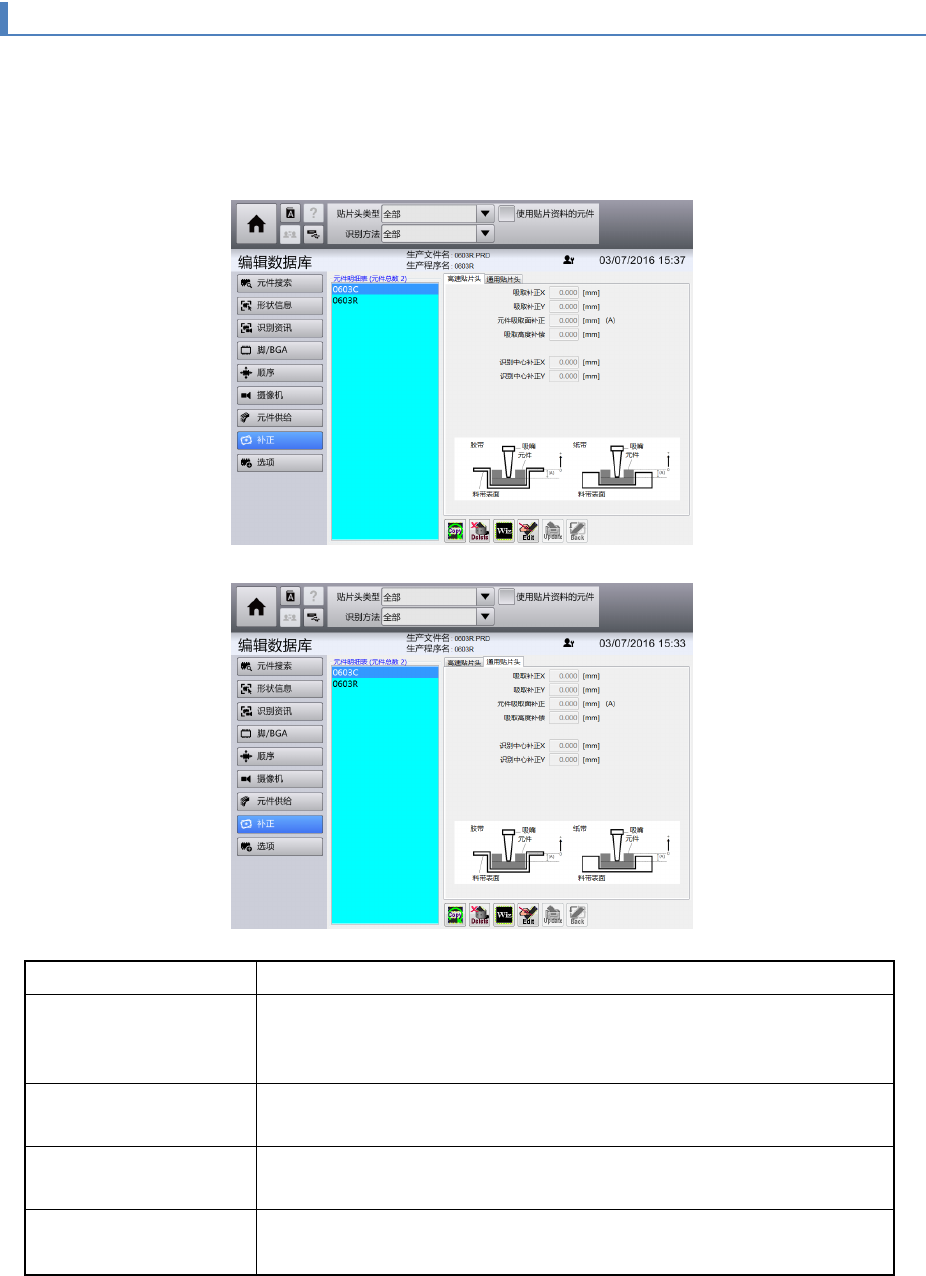 补正值信息中汇集了吸嘴从带式供料器吸取元件时所需的数据。