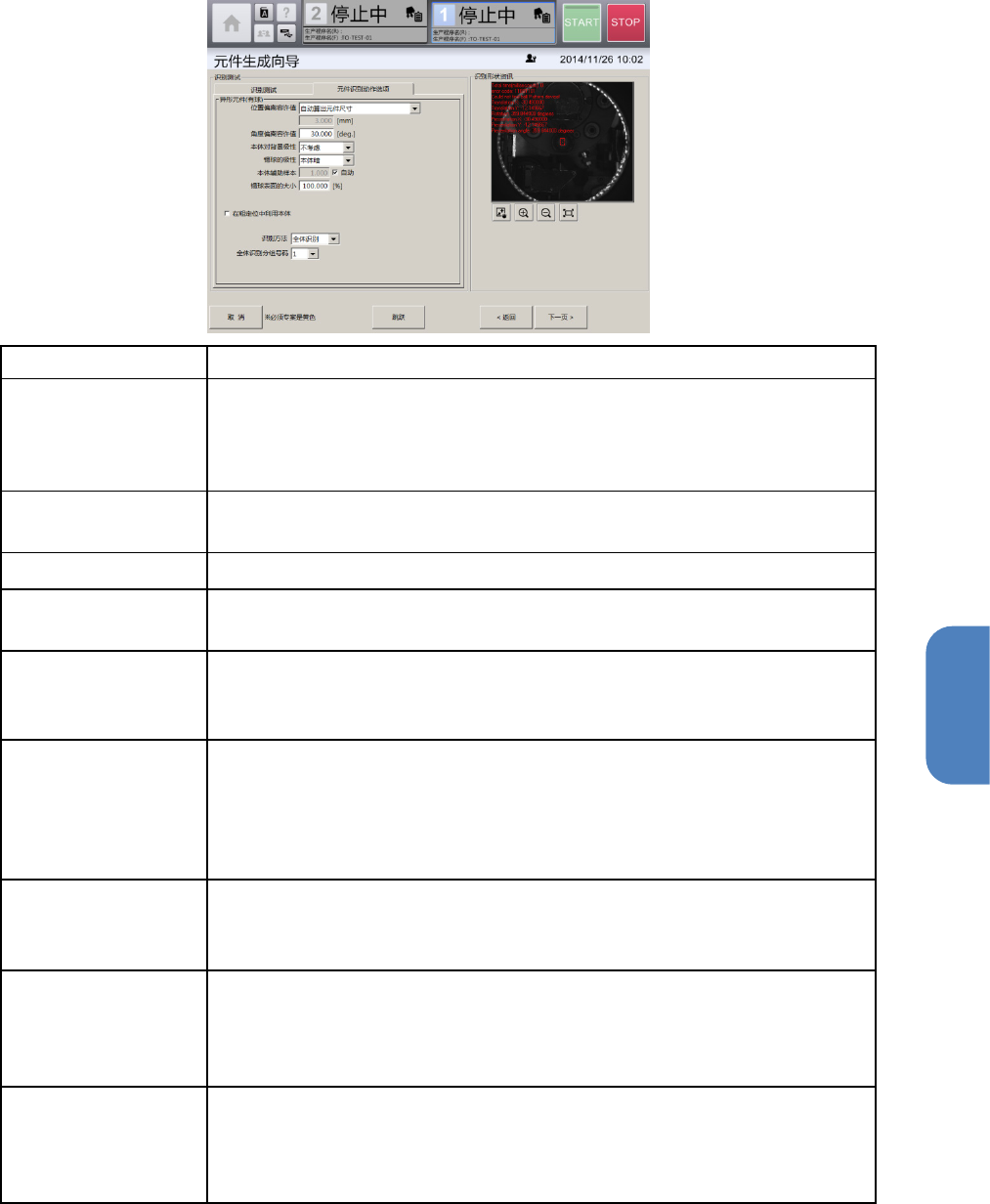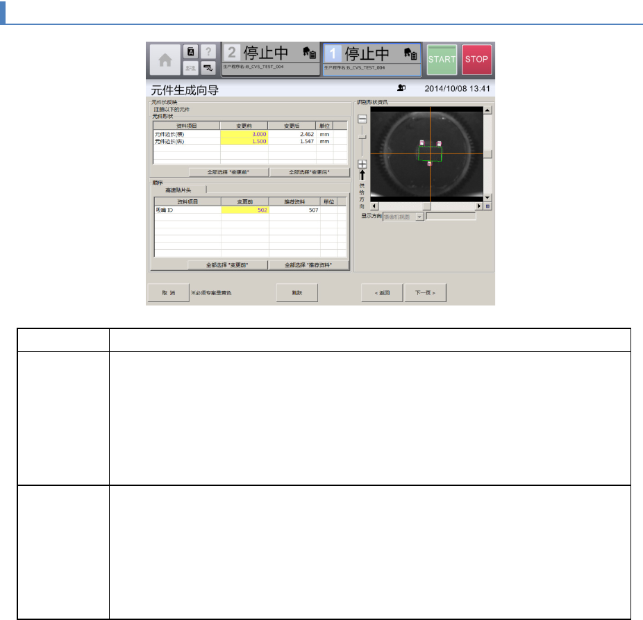 第 4 章 操作篇 4- 13. 元件生成向导 316 4- 13 - 7. 元件边长反映 画面 名称 说明 元件形状 注册元件的形状 。 • 资料项目:显示 可更改元件 边长 的项目。 • 变更前:显示更 改元件边长前的值。 • 变更后:显示更 改元件边长后的值(输入值 )。 • 单位 :显示单位。 • 全部选择 “ 变更前 ” :使用更改前的值 作为所有元件形状的设定值 。 • 全部选择 “ 变更后 ” :使用更改后的值 作为所有元…