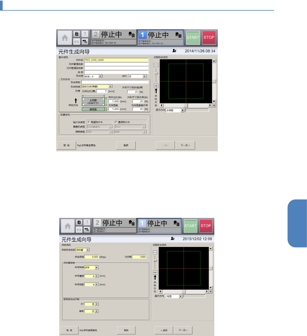 第 4 章 操作篇 4- 14. 数据制作步骤 339 4 4- 14 - 7. 制作异形元件(有脚) 数据 1 打开[元件生成向导 ]画面 后,输入元件名。 2 从[形状种类]的 下拉列表 中,选择异形元件( 有脚 )。 3 选择元件贴片中使用的 [ 贴 片头类型 ] 。 有些尺寸的元件 ,因选择的贴片头,有时不 能生成元件数据。 4 触摸 [ 下一页 ] 。 显示 [供给资讯]画面。 5 从下拉列表中分别选择 [ 供 给形式名称 ]…